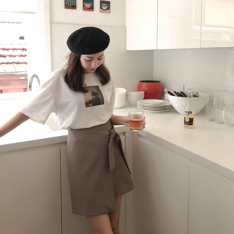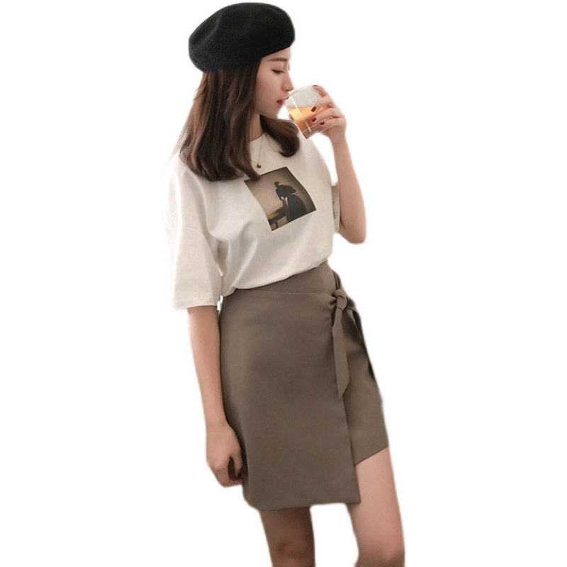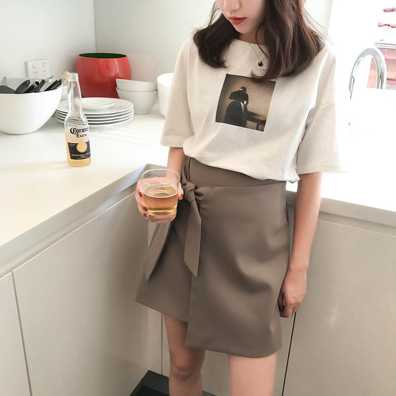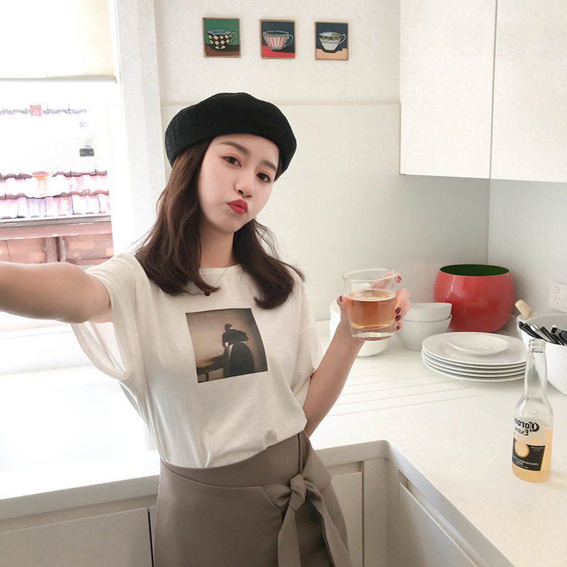 White Versatile Printed T-Shirt Korean Style Ladies Loose Large Size Thin Round Neck Pullover Short Sleeve Top