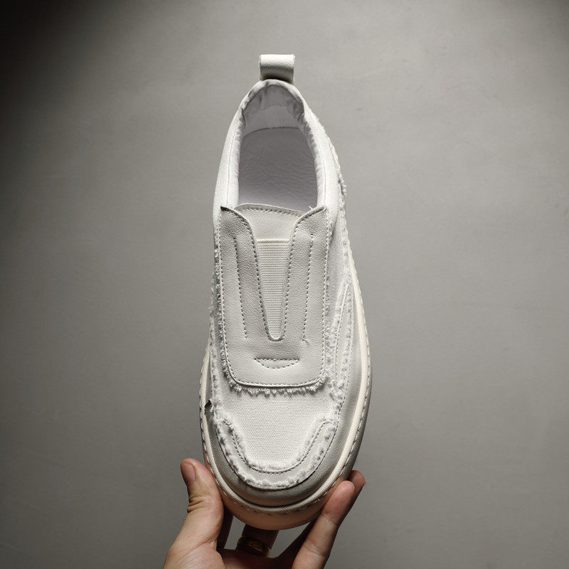 Male Shoe Tide Cards Summer New Breathable Genuine Leather Canvas Splicing Casual Shoes One Foot Pedal Small White Shoes Cloth Shoes Beggar Shoes
