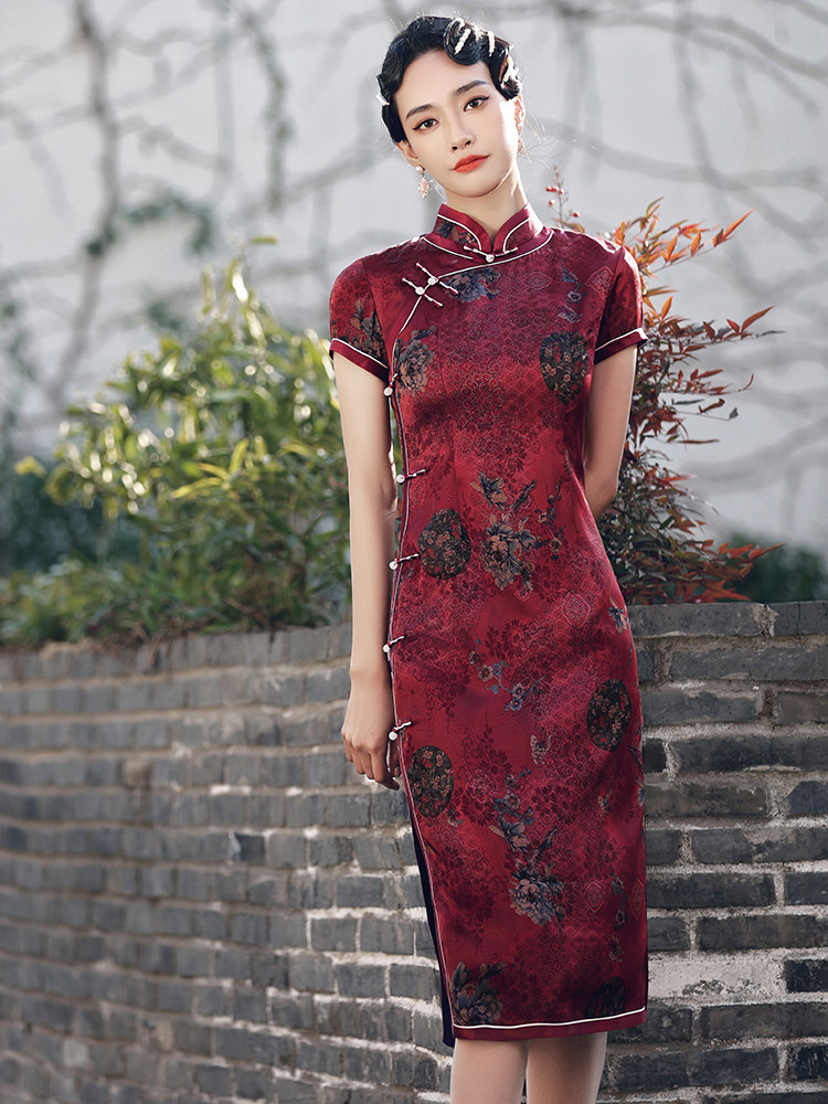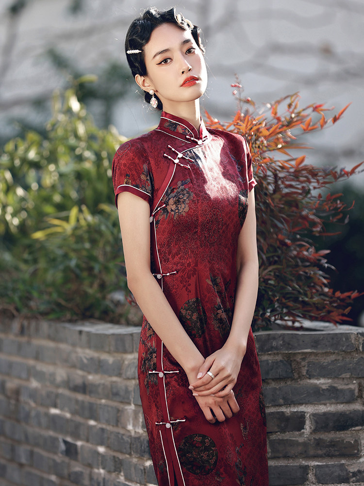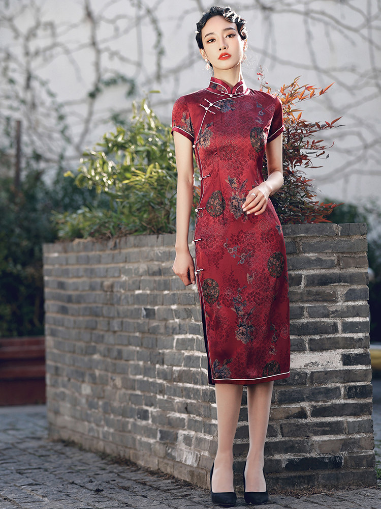 Wine red cheongsam 2022 new retro Chinese style old Shanghai mid-length version female improved dress female autumn and winter - Taobao