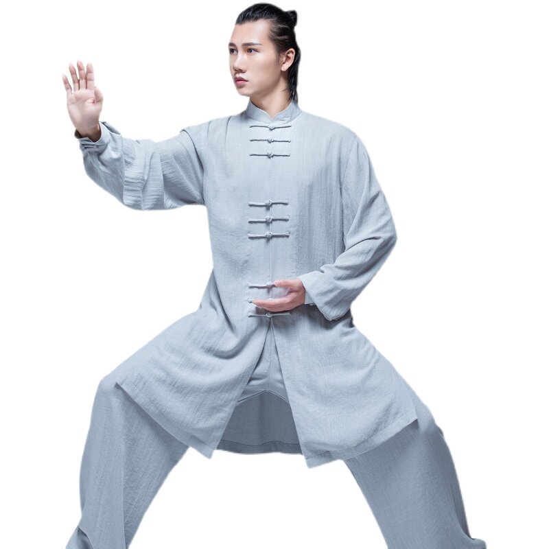Cotton and linen lengthened Tai Chi clothing women's improved new self-cultivation new Tai Chi practice clothing men's martial arts performance clothing spring and summer