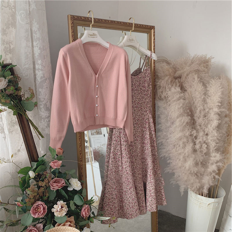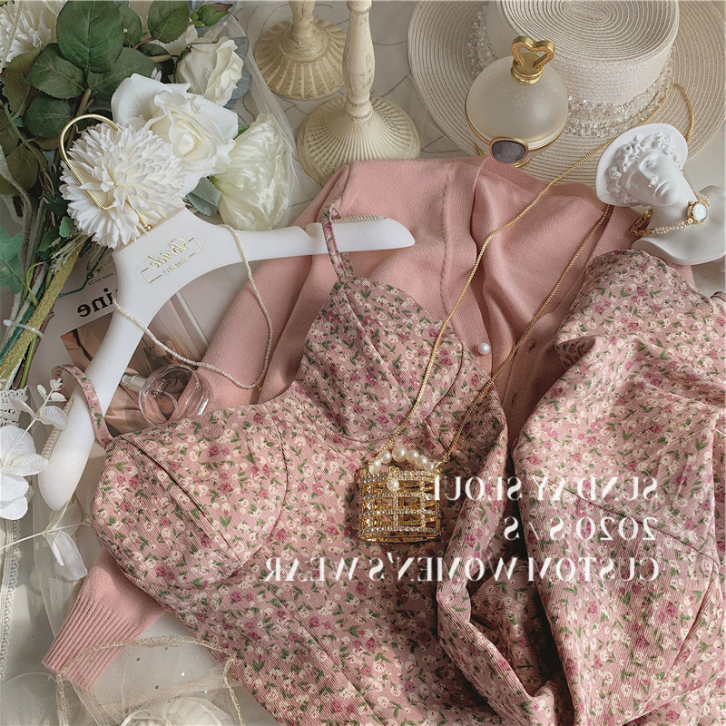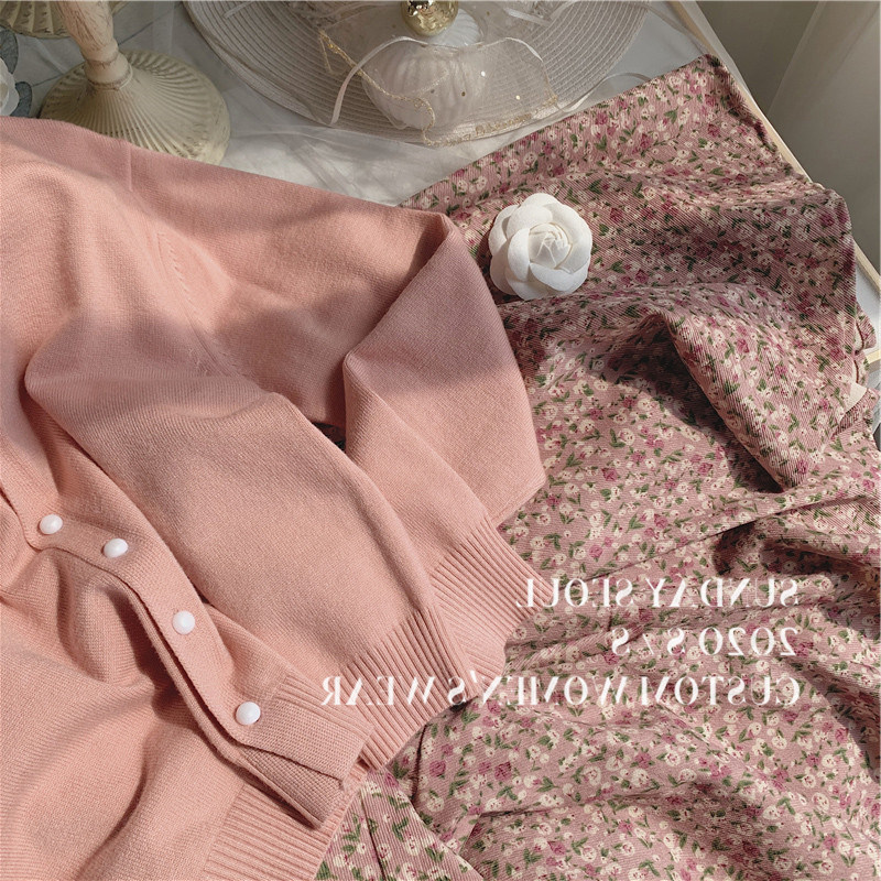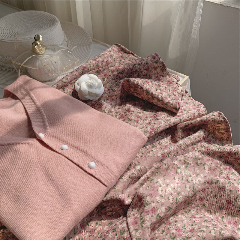 Early Spring New Women's Clothing Pink Harness Broken Flowers Knit Long Sleeve Temperament Fairy Slim Fit in a two-piece style suit
