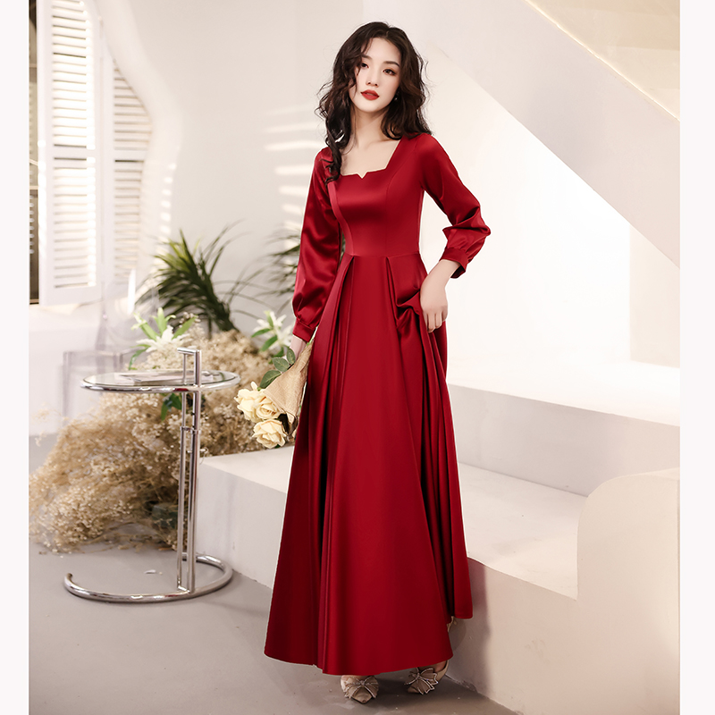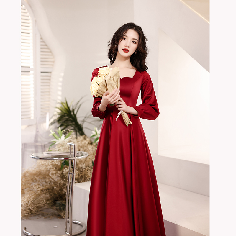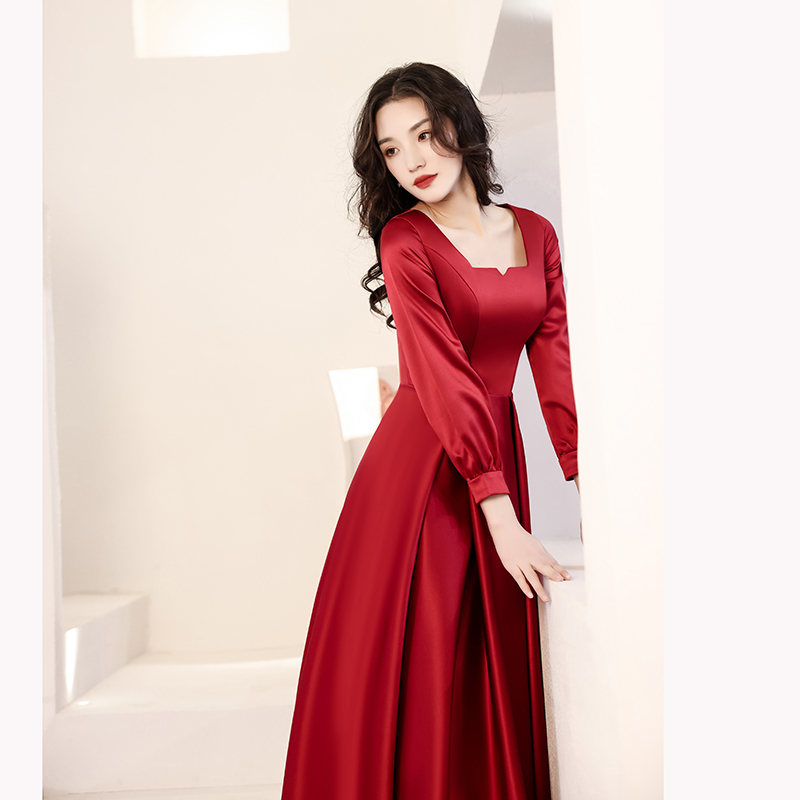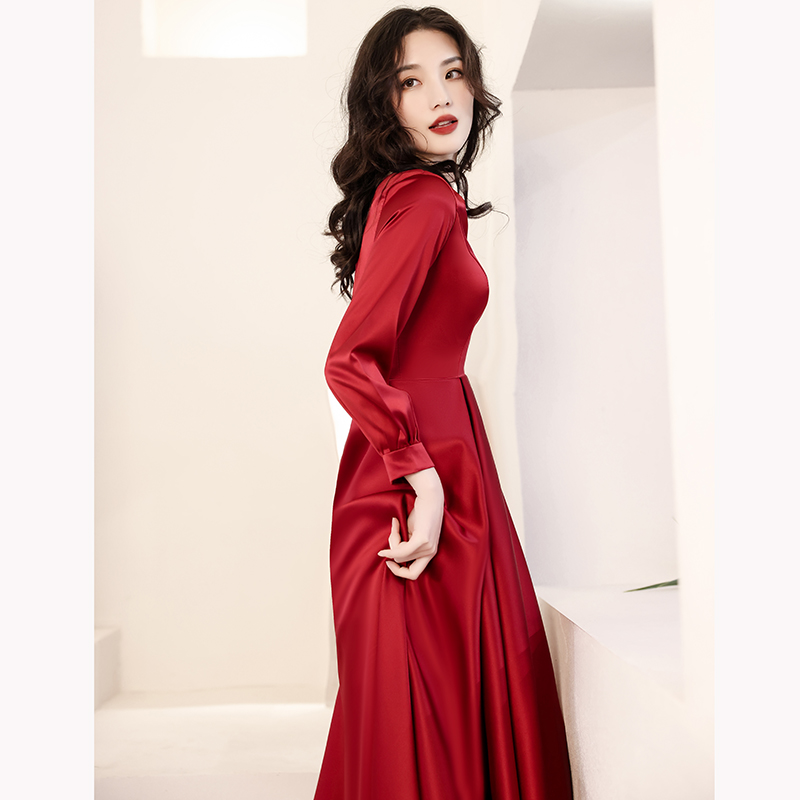 French simple satin toast dress bride 2022 new long-sleeved meat cover wine red wedding dress female autumn