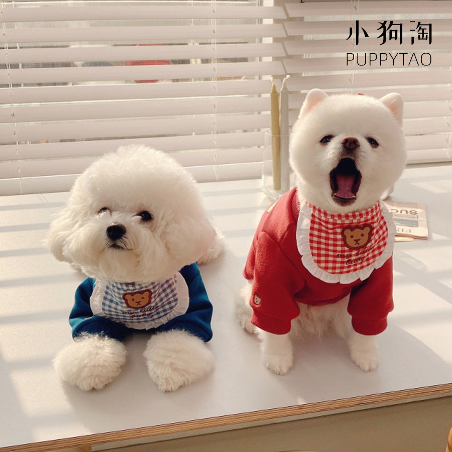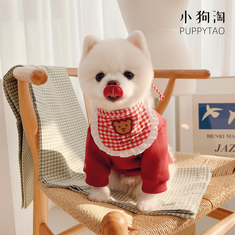 Korean Plaid Small Bear Embroidered Pet Kitty Pooch Bib Teddy Gold Wool towel Bio Beauty Scarf Bib