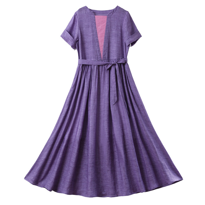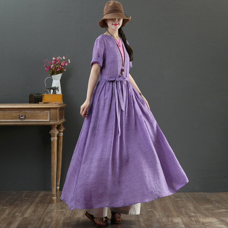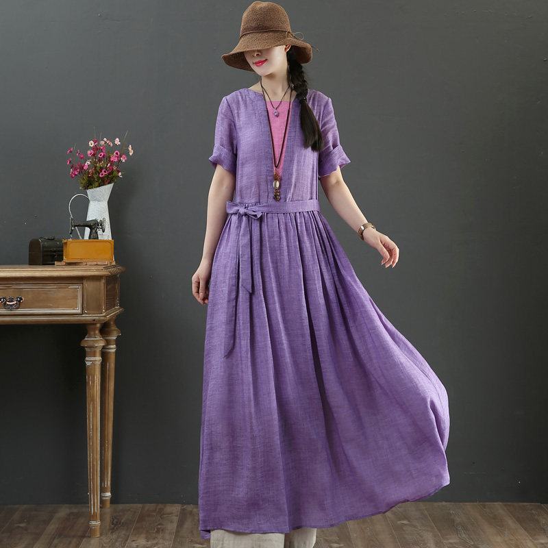 September Kaka original design pure hemp summer short-sleeved long dress big swing skirt bow dress 3003