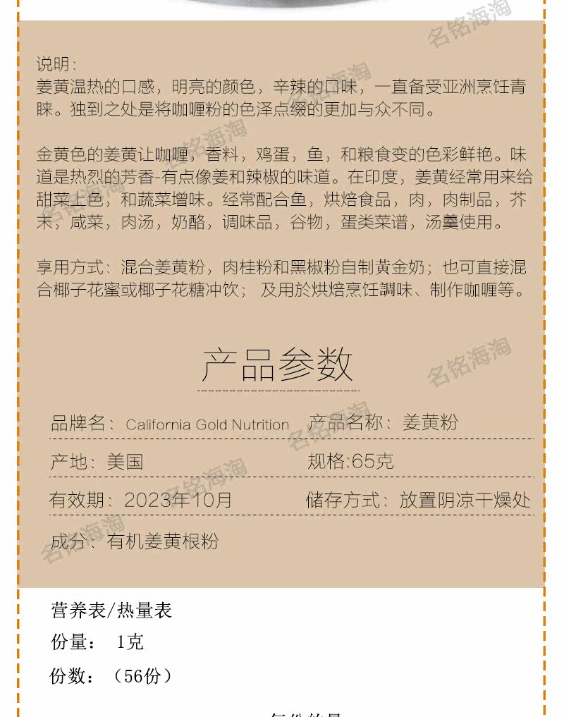 Spot California Gold Nutrition organic turmeric powder healthy diet material to drive cold 65g