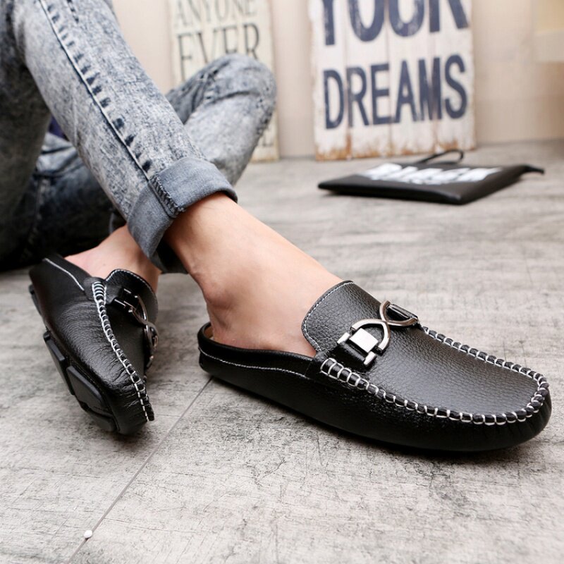 Men's sandals Summer individuality no heel Baotou true leather shoes Semi slippers Slippers Wave Men's Shoes Half Tug Summer Peel