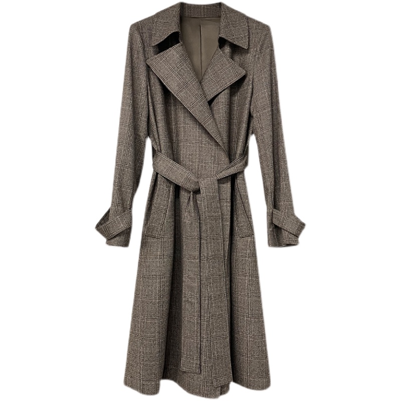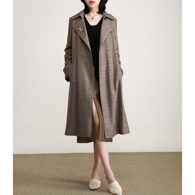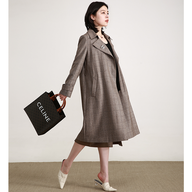 NZ High-end Temperament Heben Wind Retro Blend Curry Color Plaid Windsuit Woman Coat Medium Long Version Wool Cashmere Big Clothes Autumn
