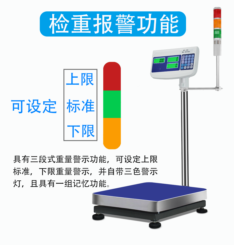 30kg 30kg 2g (with three-color alarm lamp) 60kg 5g (with three-color alarm lamp) 100kg 10g (with three-color alarm lamp) 150kg 20g (