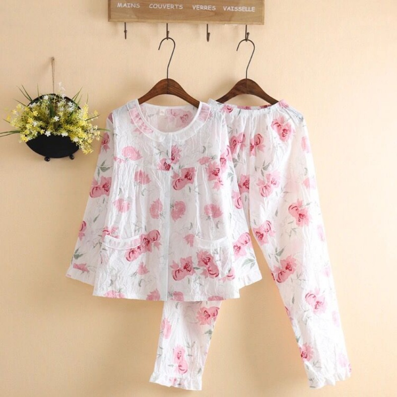 Japanese washcloth pajamas women's summer long sleeves thin classic floral woven faux cotton pajamas loungewear set