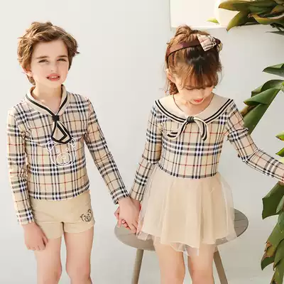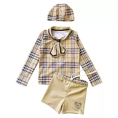 Children's swimsuit boys and girls with the same high-waisted two-piece new plaid long-sleeved boxers medium and large children's swimsuit with hat