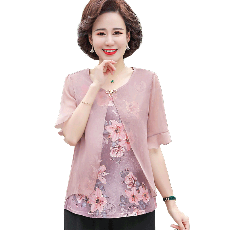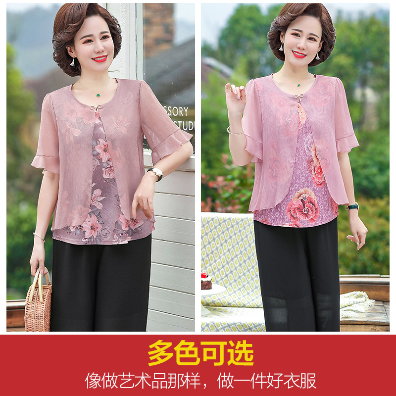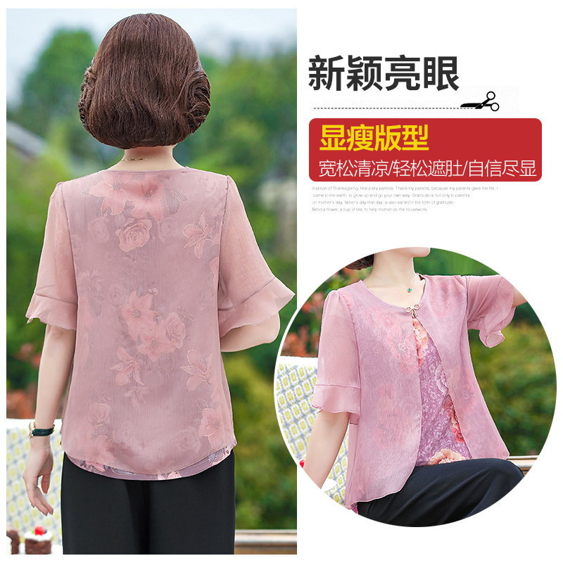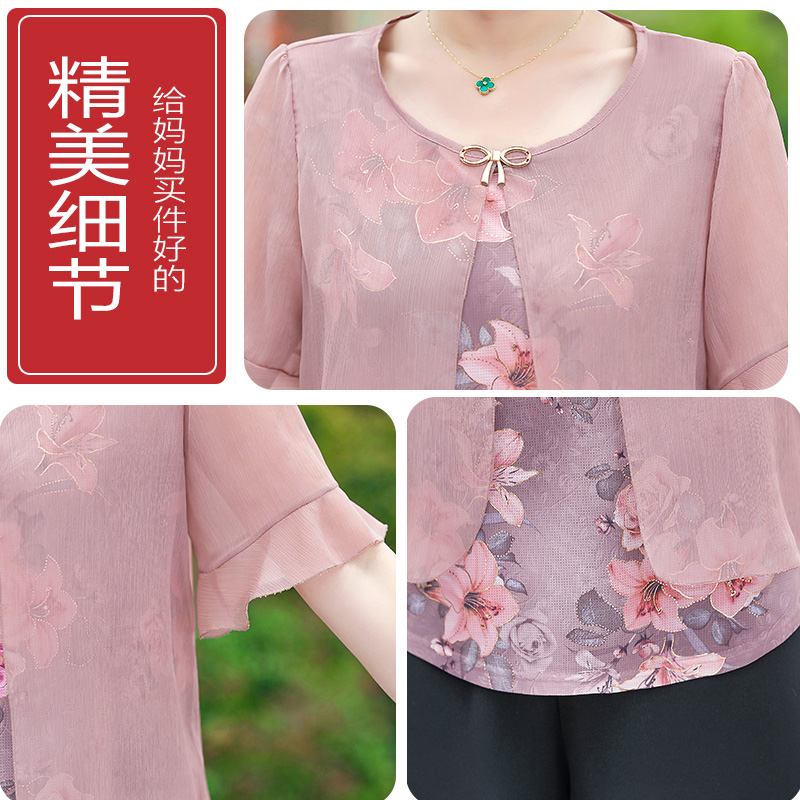 Middle-aged and elderly women's chiffon fake two-piece short-sleeved T-shirt women's middle-aged mother's clothing loose large size age-reducing Western style summer dress