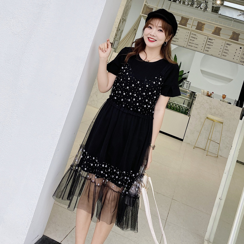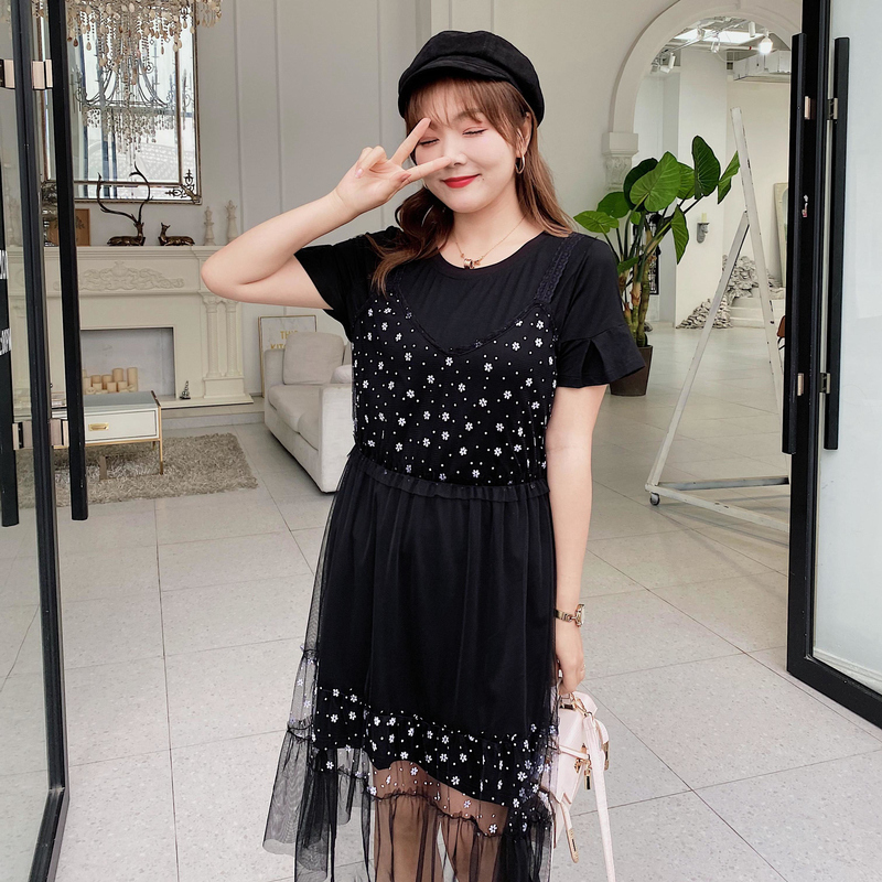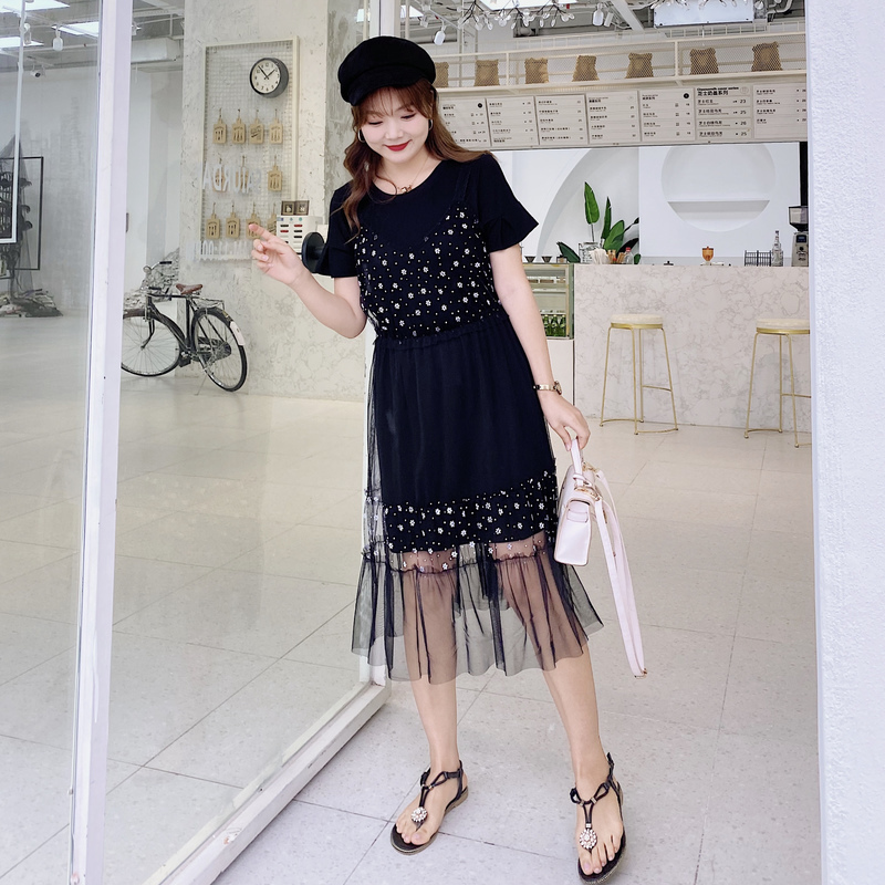 Cai Duobao large size women's fat sister 2021 summer new lotus leaf mesh dress two-piece set T0136N