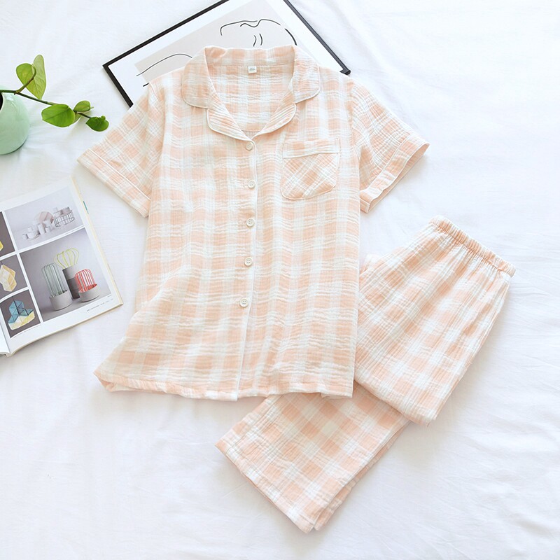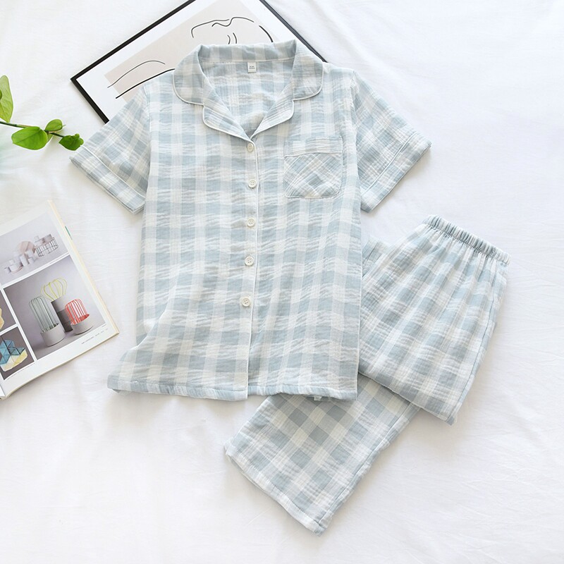 Couple short sleeve pyjamas female summer thin cotton double layer gauze minimalist plaid half sleeve long pants men's home suit suit