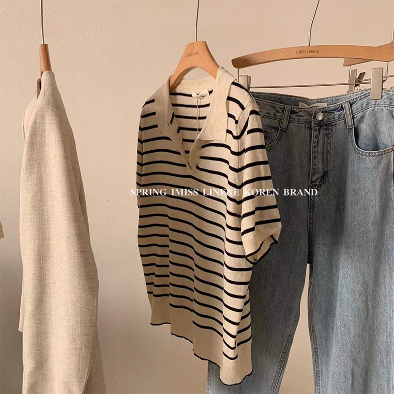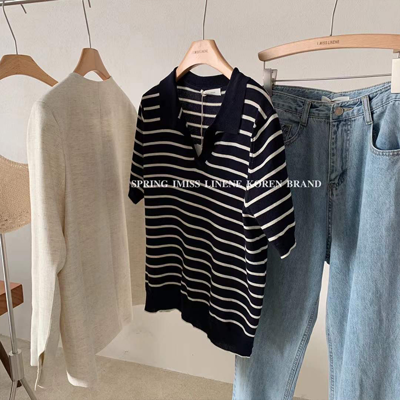 Net red striped polo shirt women's thin section ins tide 2021 summer new loose western style fashion knitted sweater top