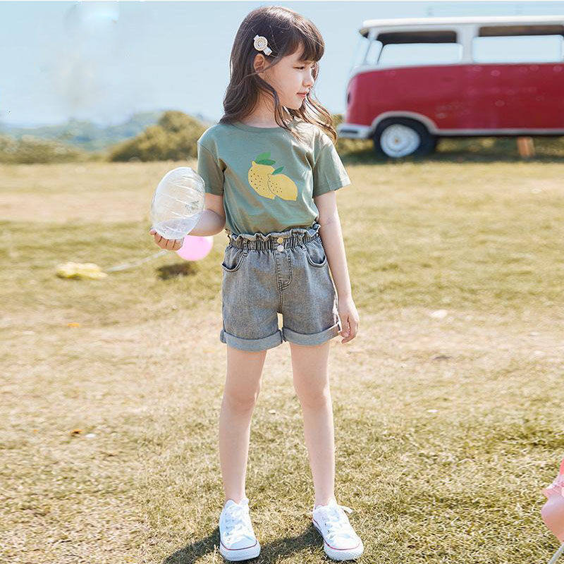 Avocado Green Denim Shorts Green Top Grey Denim Shorts White Heart Top Denim Shorts Black Lettering Top Denim Shorts Bright Pink Girls Top Denim Shorts