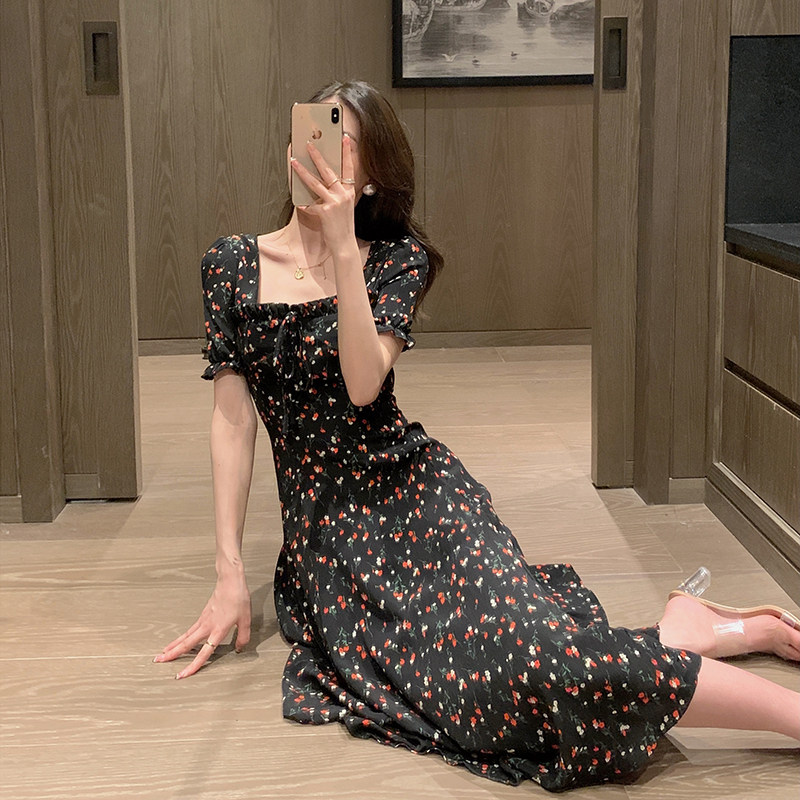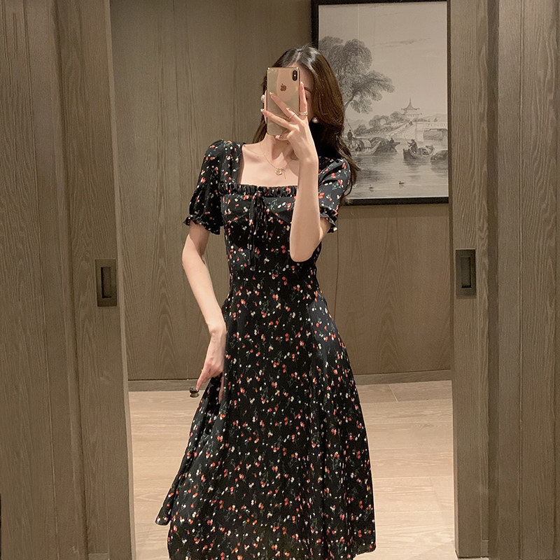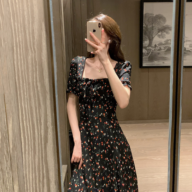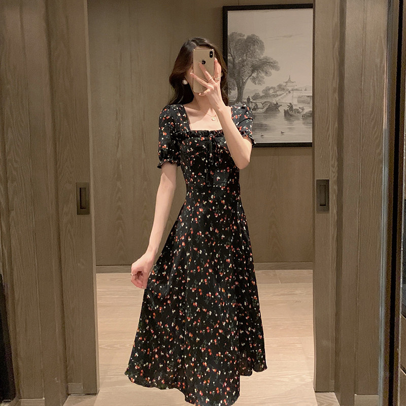 Square neck dress women's summer 2022 new French retro backless first love floral skirt small fresh chiffon long skirt