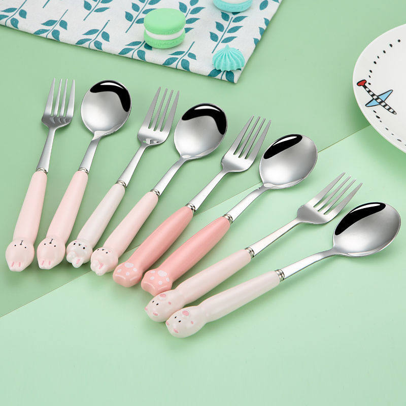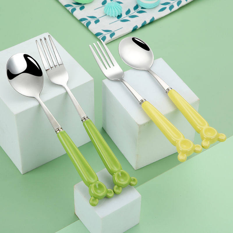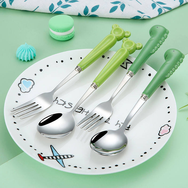 Cat claw blue (spoon fork chopsticks box) four pieces a rogue rabbit ear (spoon fork chopsticks box) b dinosaur green (spoon fork chopsticks box) four pieces c Mickey yellow (spoon