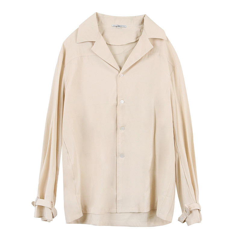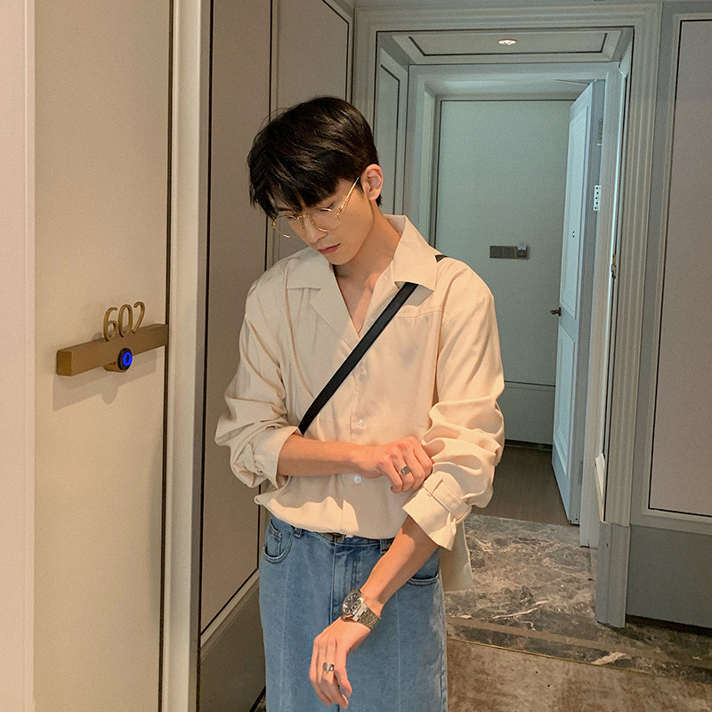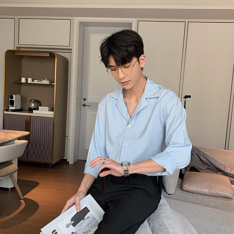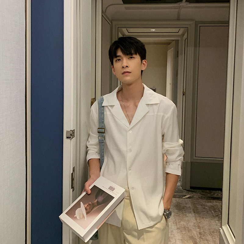 Hualun spring niche design drape Cuban collar shirt men's long-sleeved solid color slim Korean casual shirt