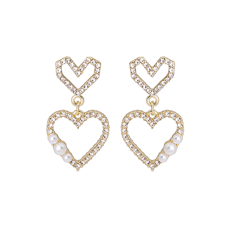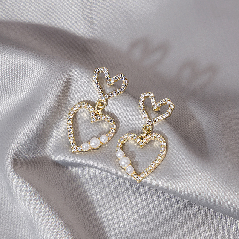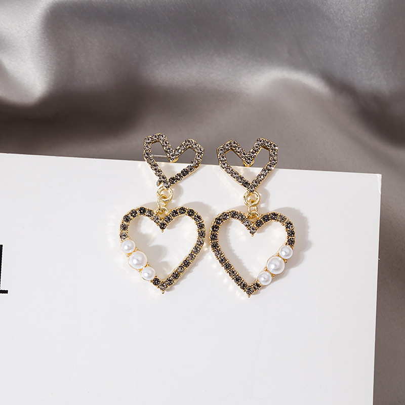 Silver needle sweet double heart diamond pearl earrings simple Japanese and Korean water droplets long version temperament fashion peach heart earrings women