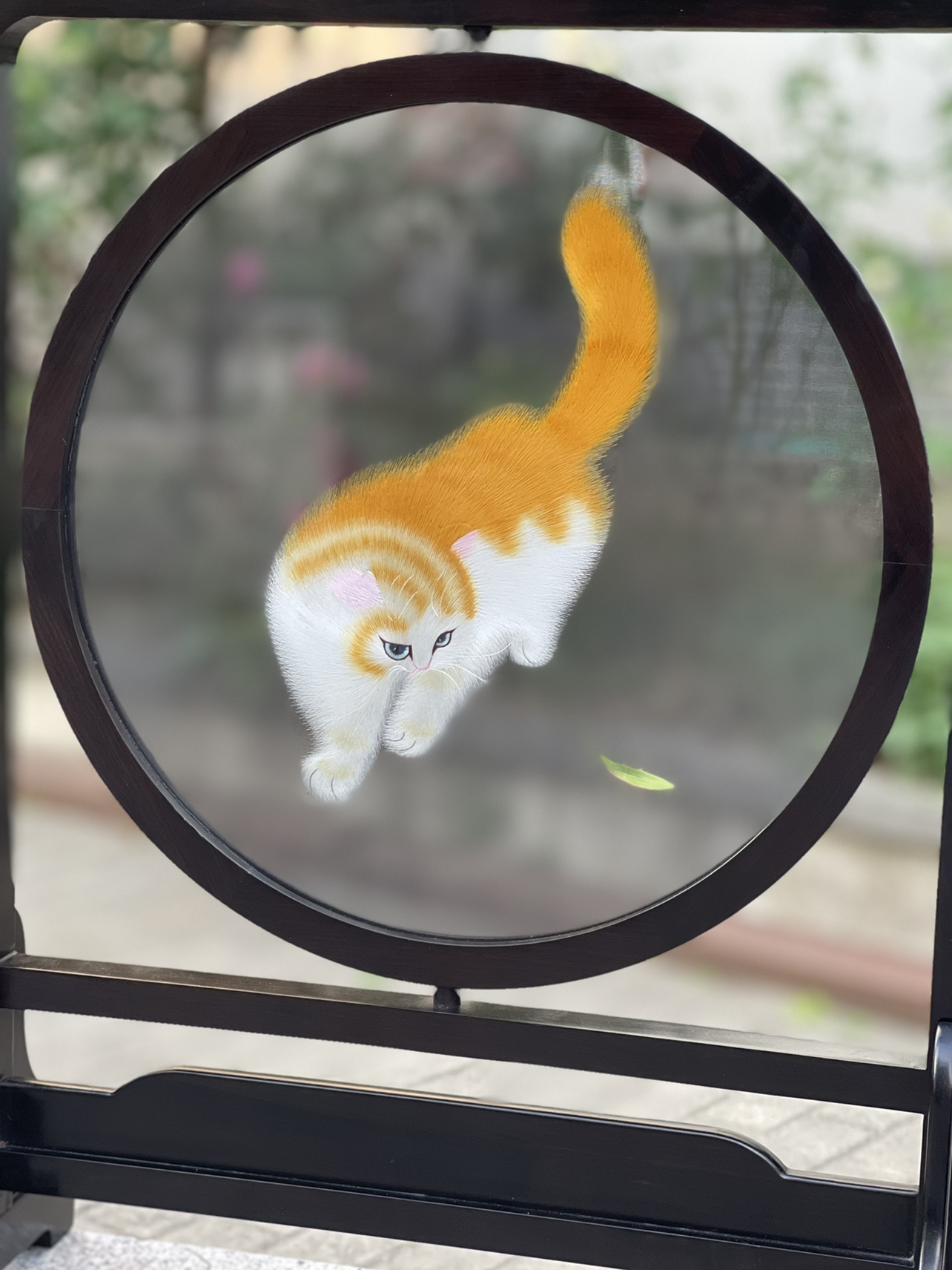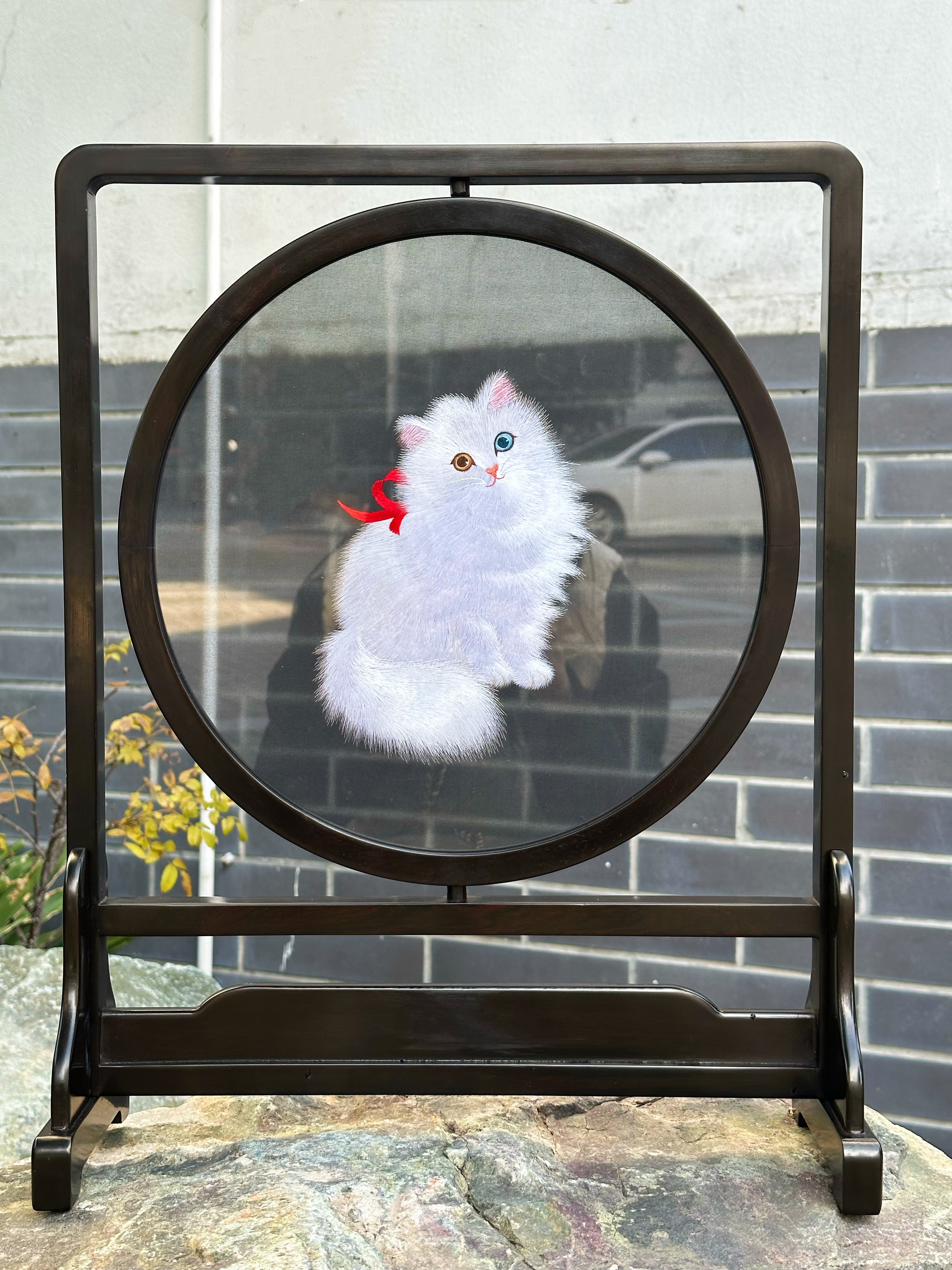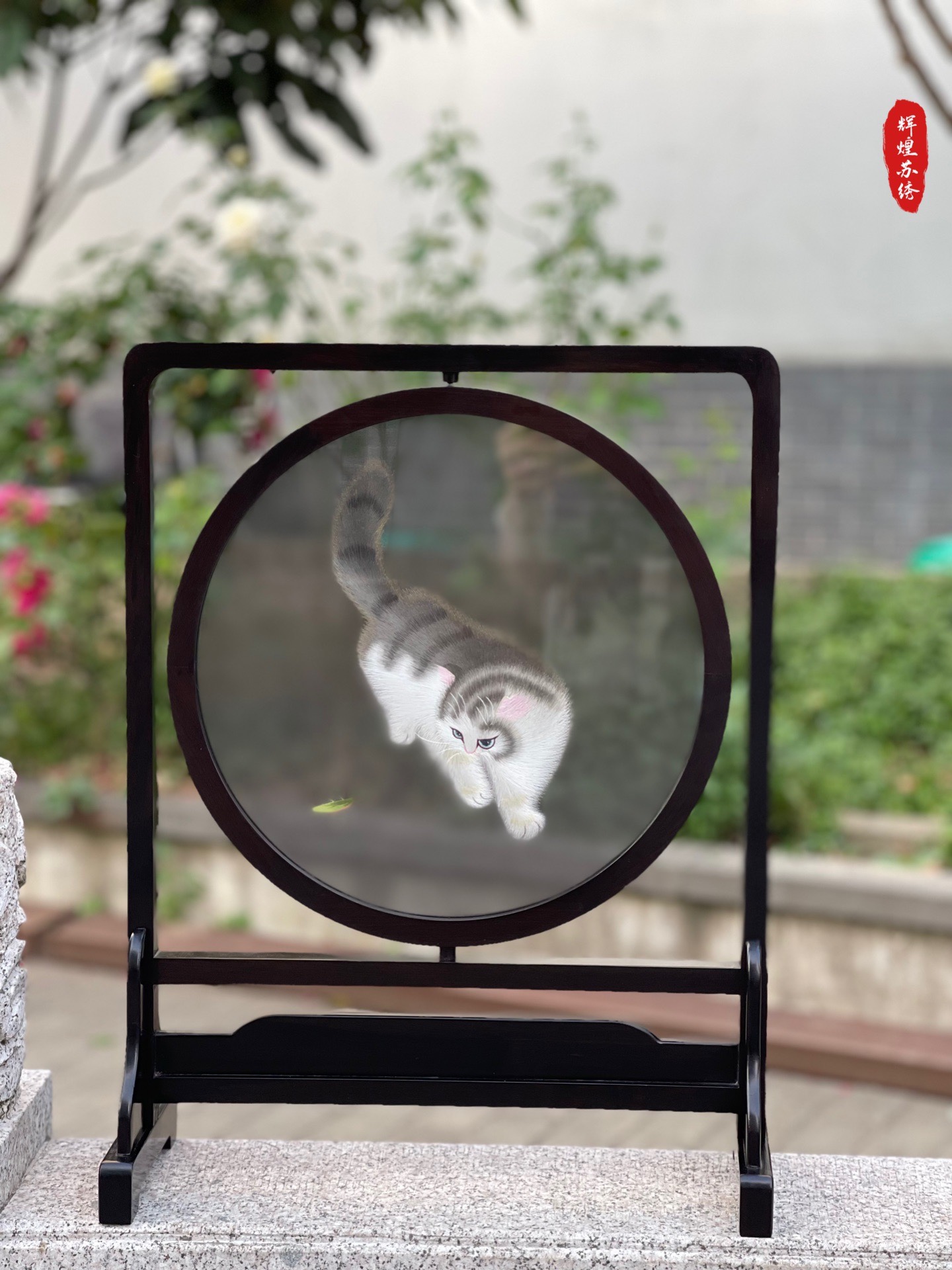 Finished product Suzhou hand embroidery boutique Taiwan screen heterochromatic cat mantis cat double-sided embroidery home decoration conference gift specialty