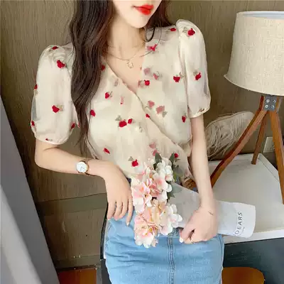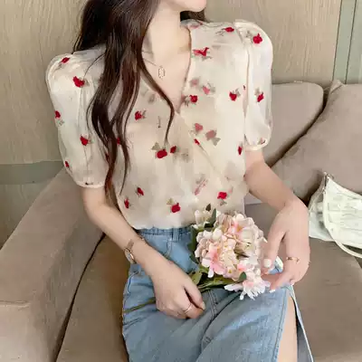Bubble sleeve top women's summer new French design sense niche V collar waist short sleeve mesh chiffon shirt shirt