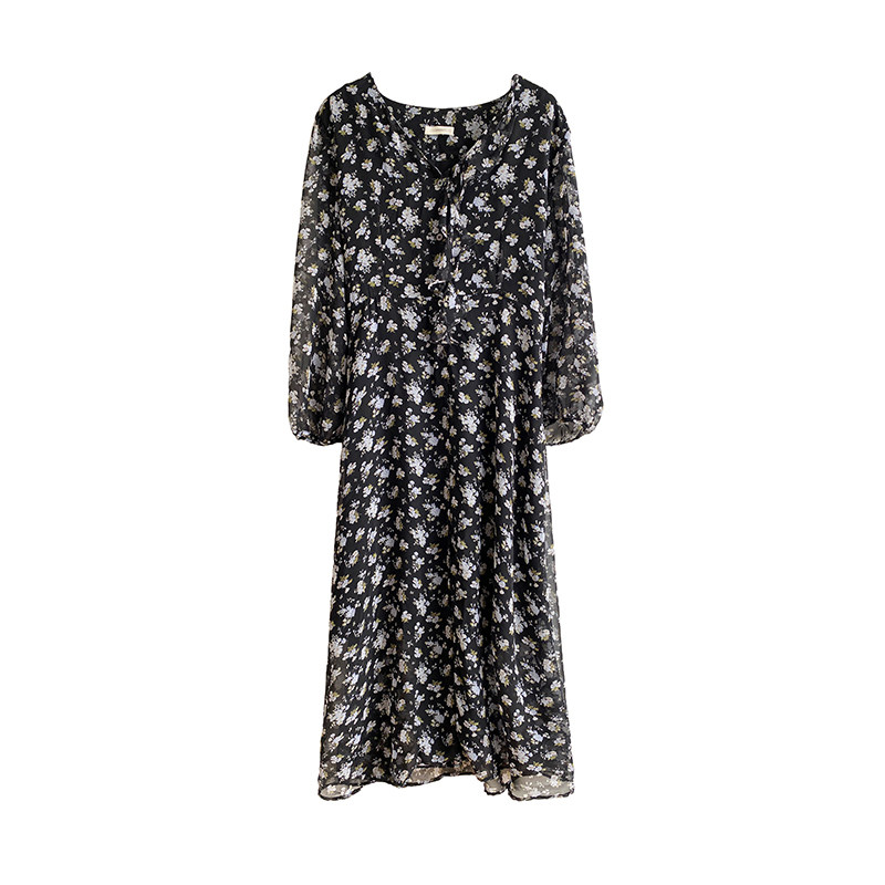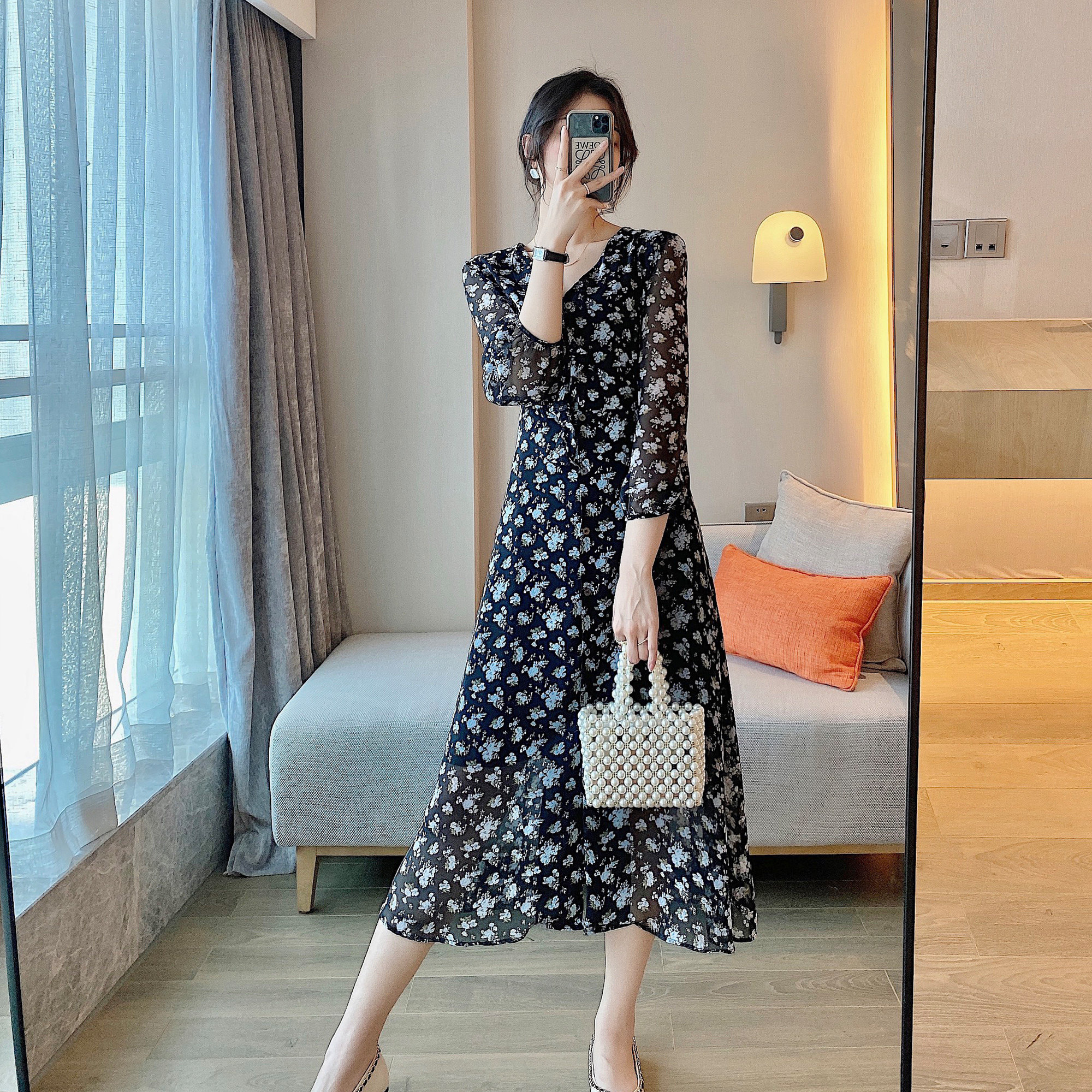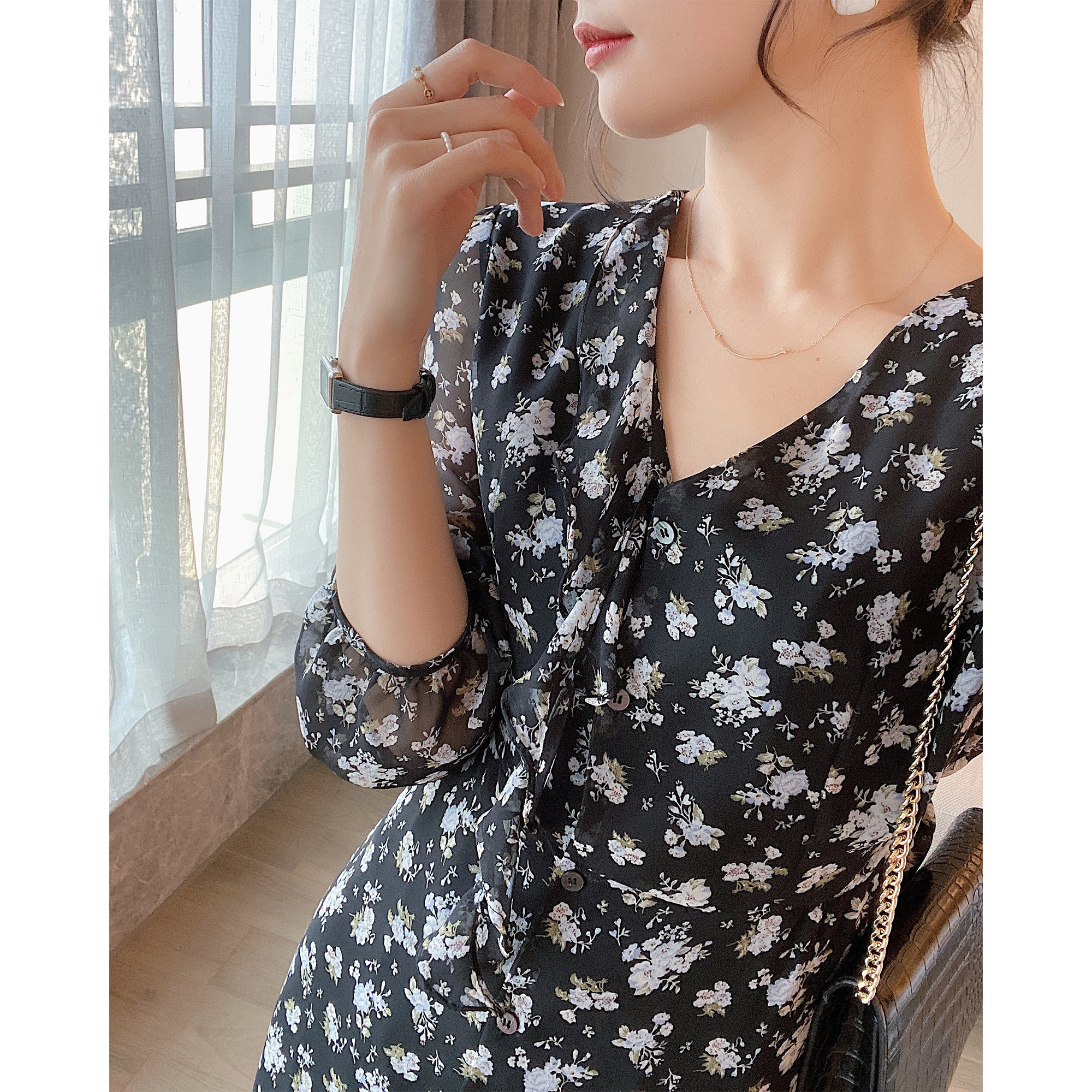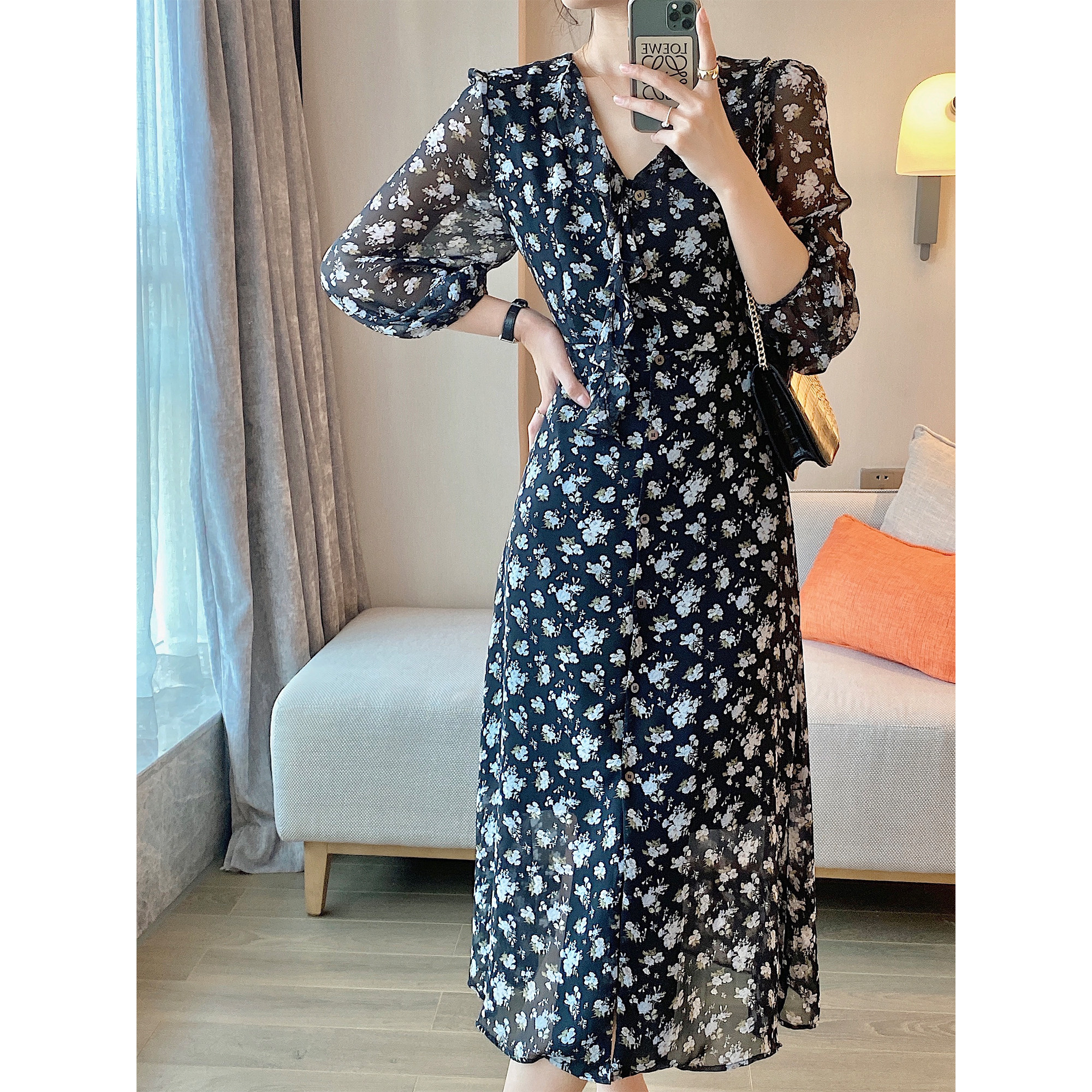 Full honey custom single-breasted v-neck floral temperament dress women's French retro Hepburn style 2021 new spring