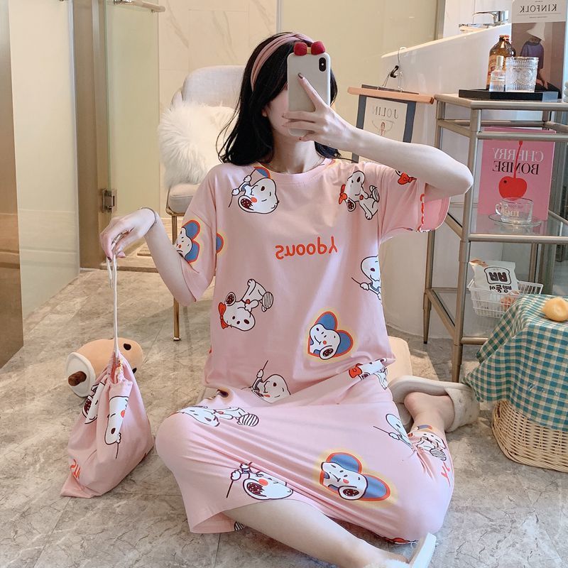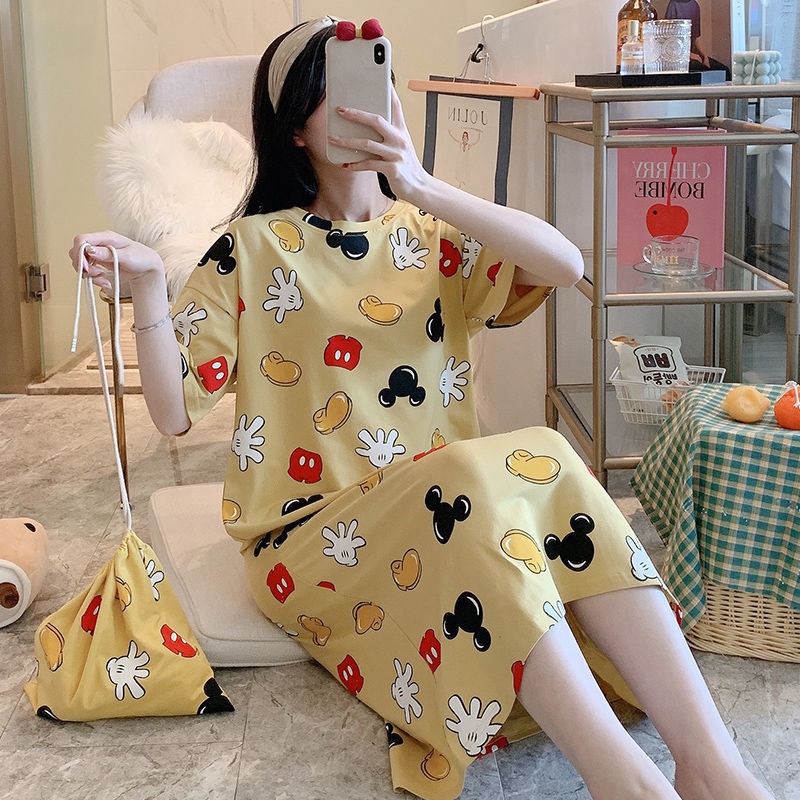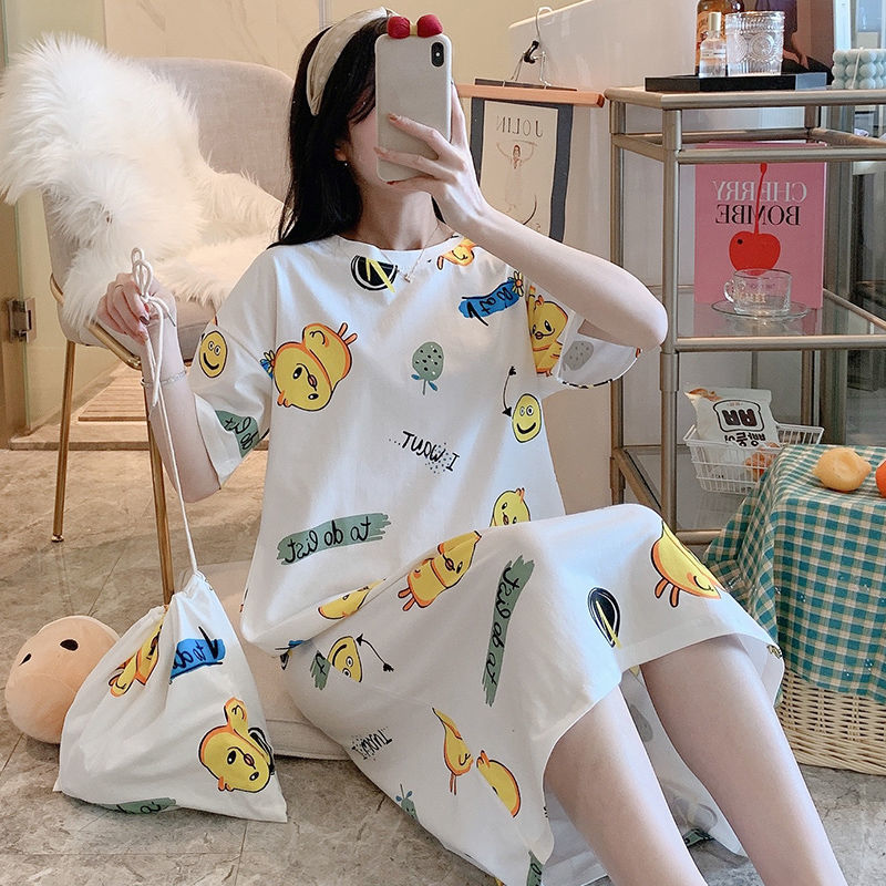 Sweet and small fresh sleeping dress Women in summer pure cotton loose short sleeves over knee long version Skirt Woman Korean version Letter Home Residence Dress