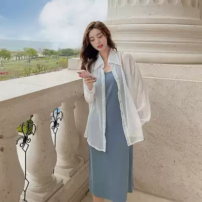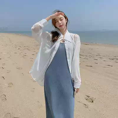Set women's summer white sunscreen shirt thin shirt knitted suspender skirt inside dress two-piece dress