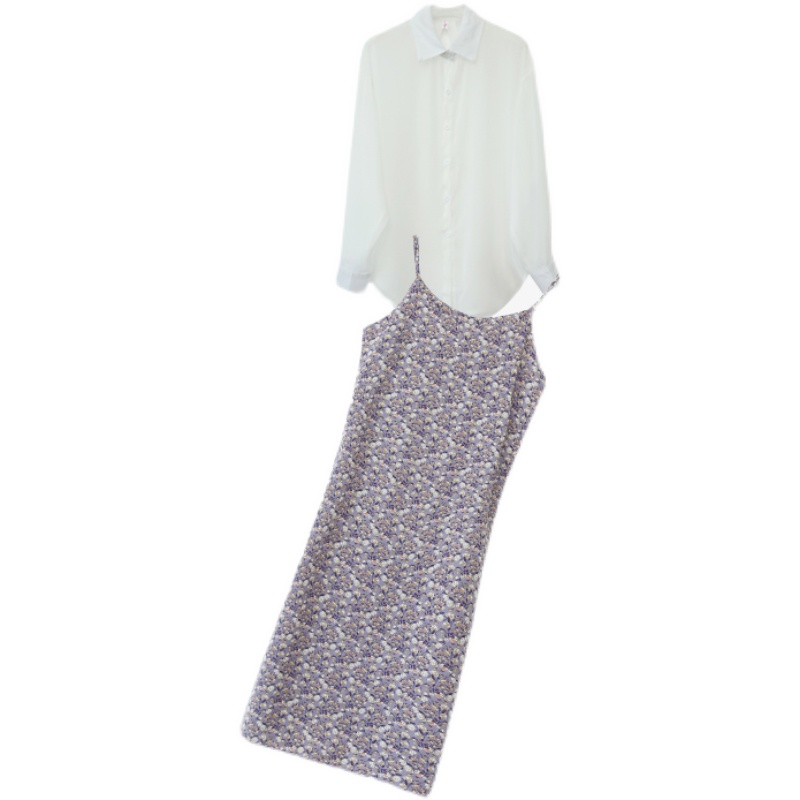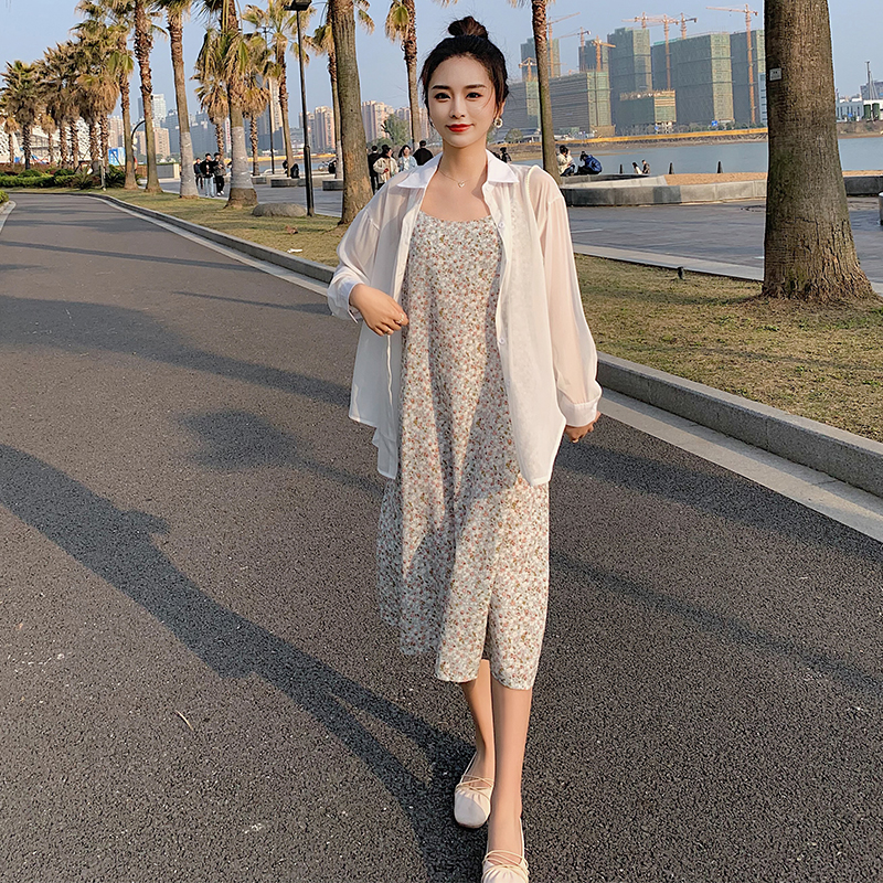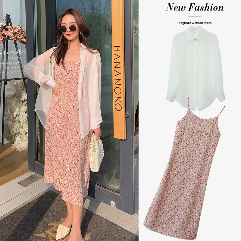Korean maternity dress 2021 summer thin section net red fashion mid-length suspender dress sunscreen shirt two-piece set tide