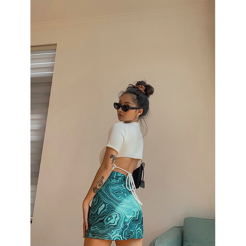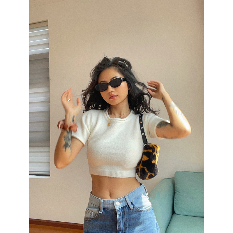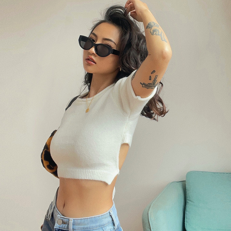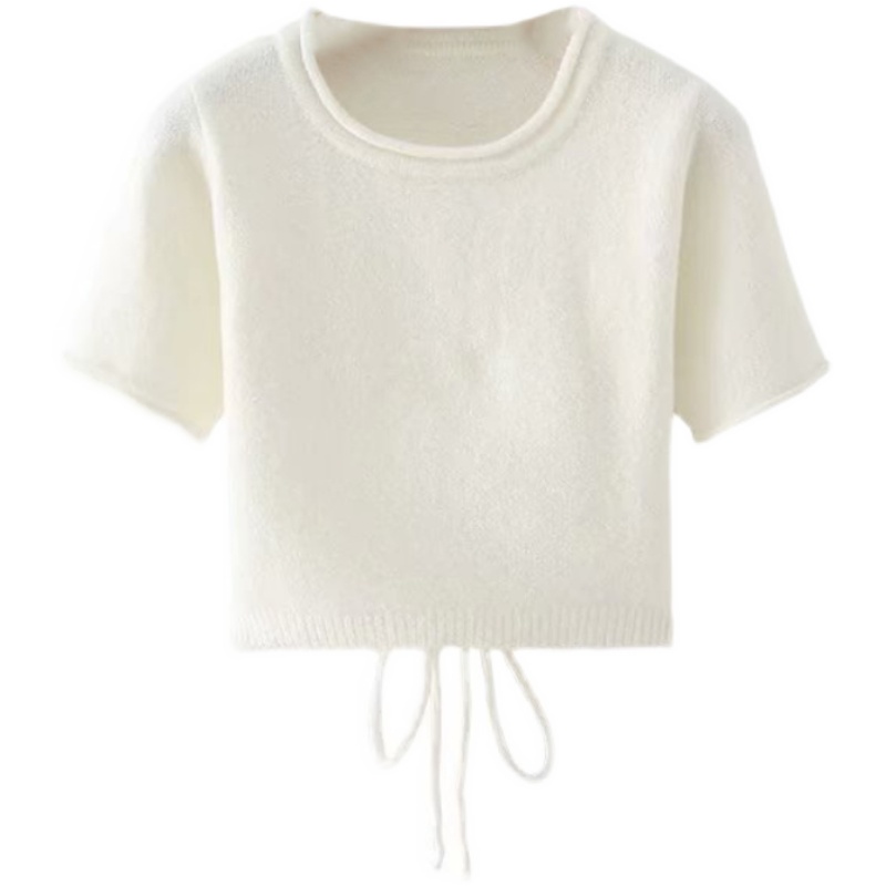 ins blogger with the same style Lazy Round Collar Dew Back Hollowed-out High Waist Tight Design Sense Short Knitted Blouse Women
