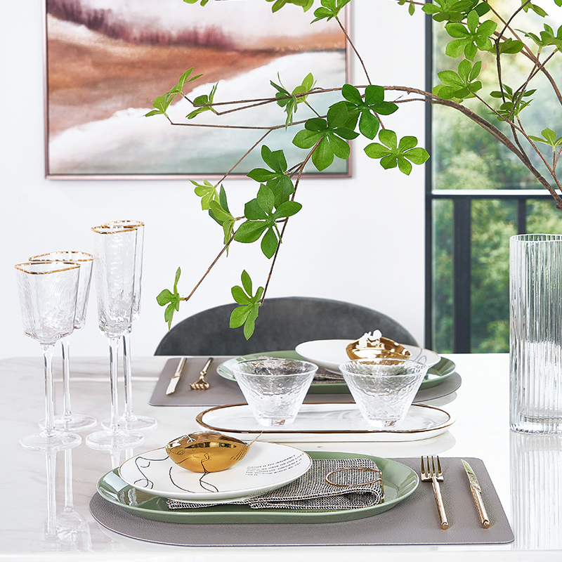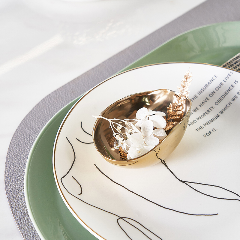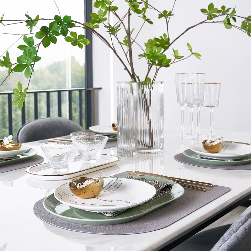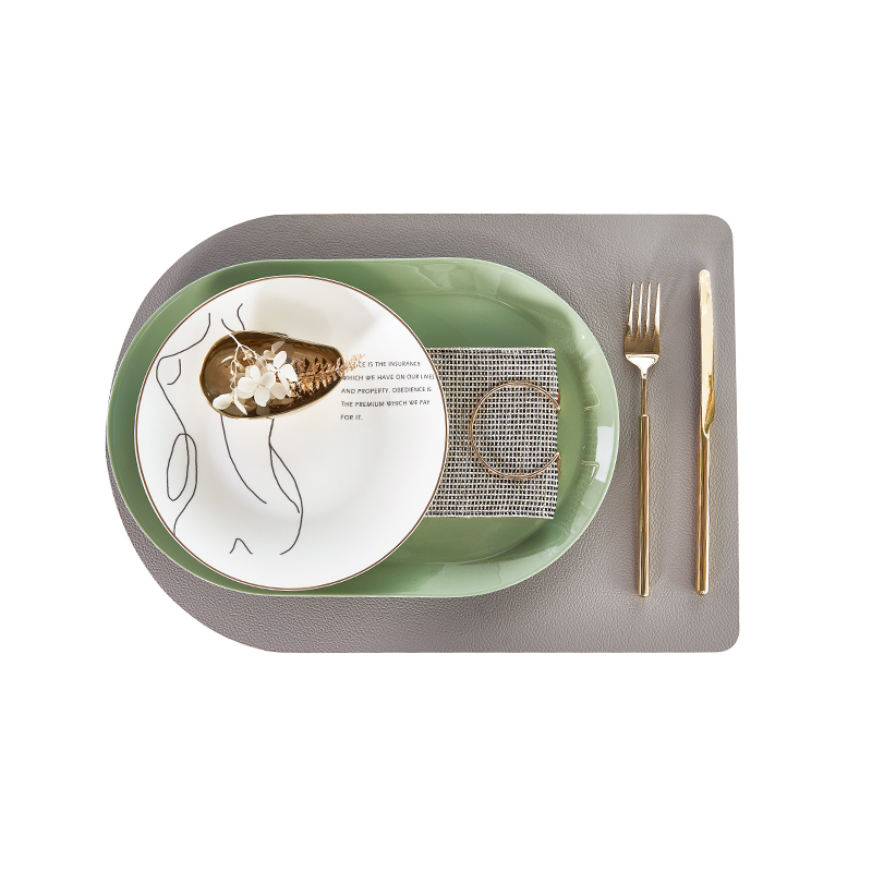 Table set 0664 grey plus blue double sided rectangular semi-circle leather dining cushion square brass dining buckle Nordic green oval color porcelain tray titanium alloy color stainless steel Alien small flush white frosted line female pattern tray