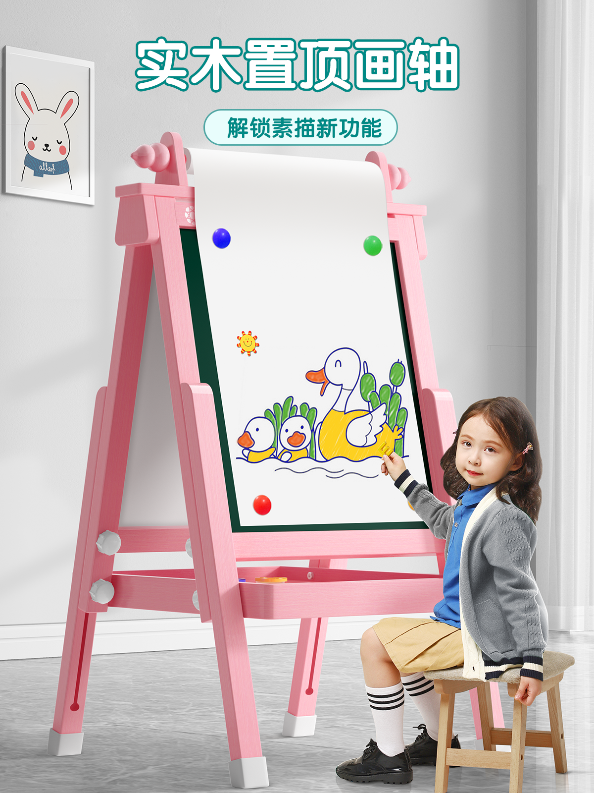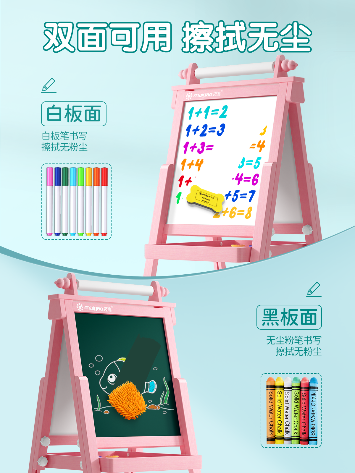 Large pink solid wood drawing board + dust-free on both sides + mini (2-9 years old)