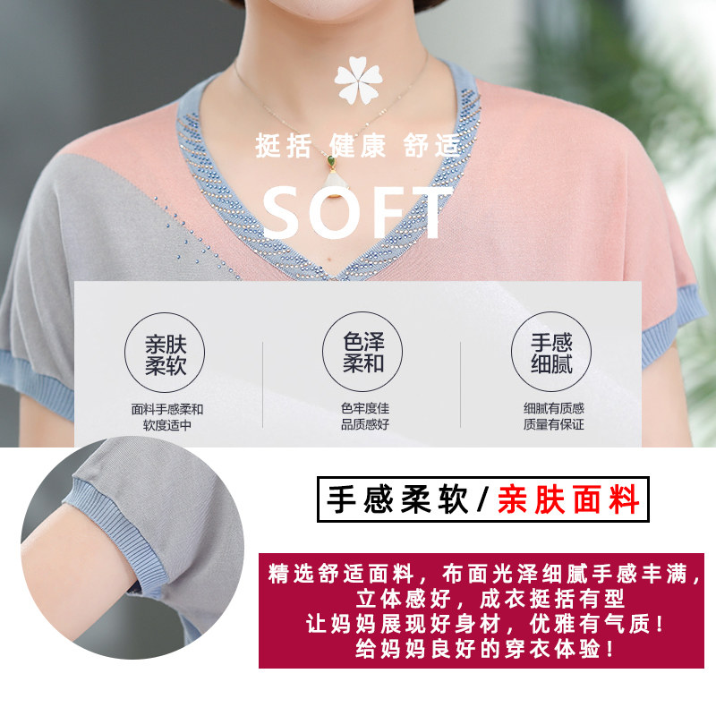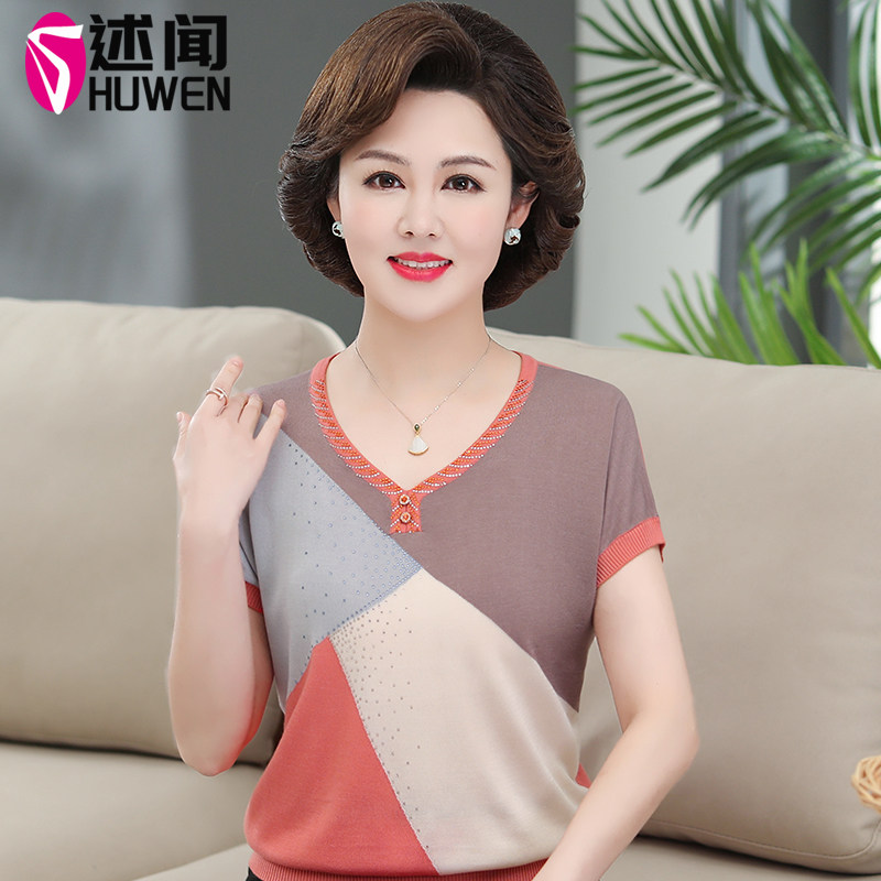 Young Mom Summer Loaded Knit Cardiovert Middle Aged Woman Half Sleeve Summer Foreign Air Short Sleeve T-shirt 50-Year-Old Temperament Blouse-Taobao