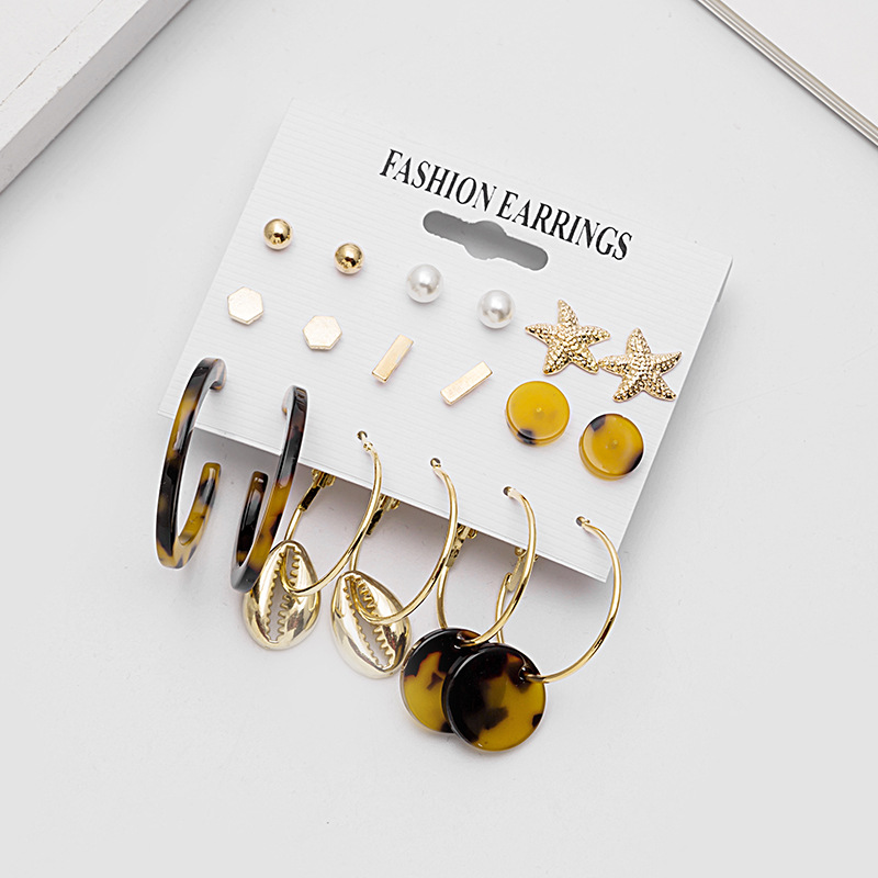 Europe and the United States all-match multi-pair earrings metal exaggerated personality acetic acid acrylic BAO WENC circle shell 9 pairs of ear pins