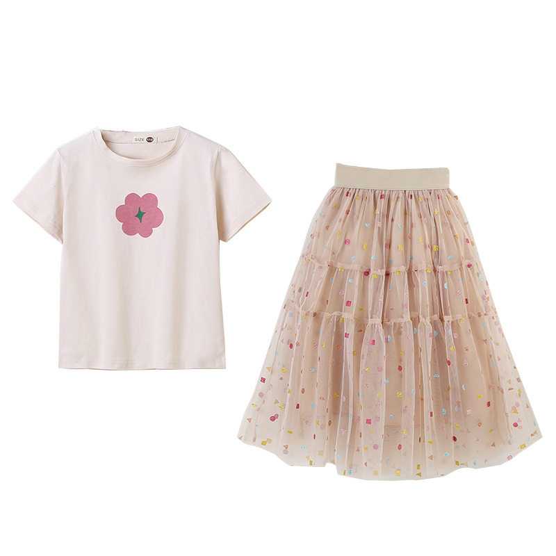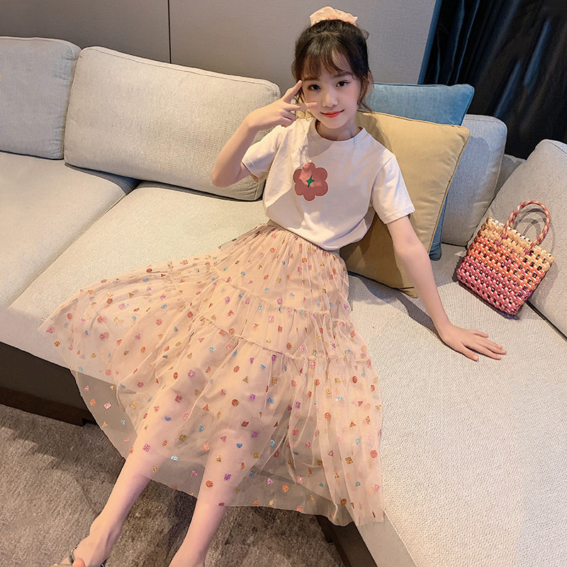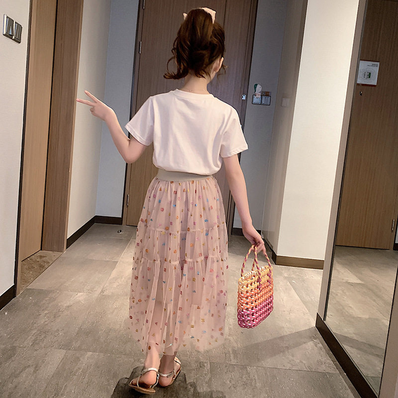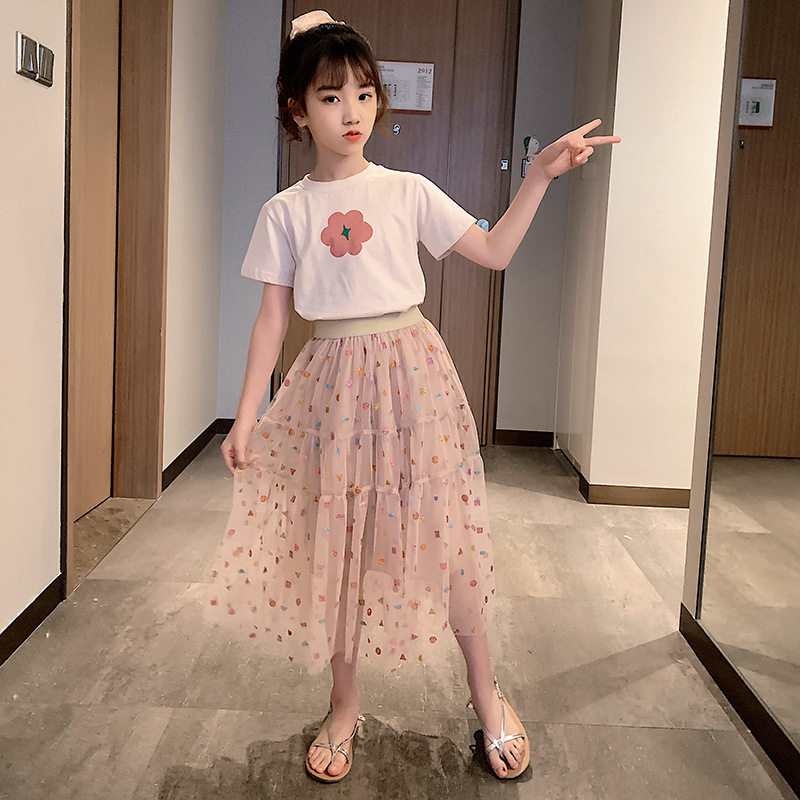 next jazz girls suit 2021 summer new Korean version of the big children's mesh skirt short-sleeved T two-piece