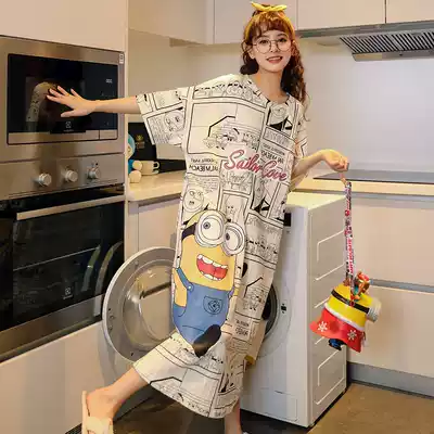 Long version of nightdress Women summer short sleeve cotton thin Korean pajamas Medium-length dress cute cartoon fresh casual loose