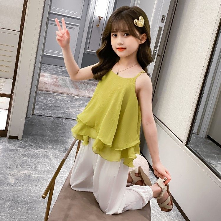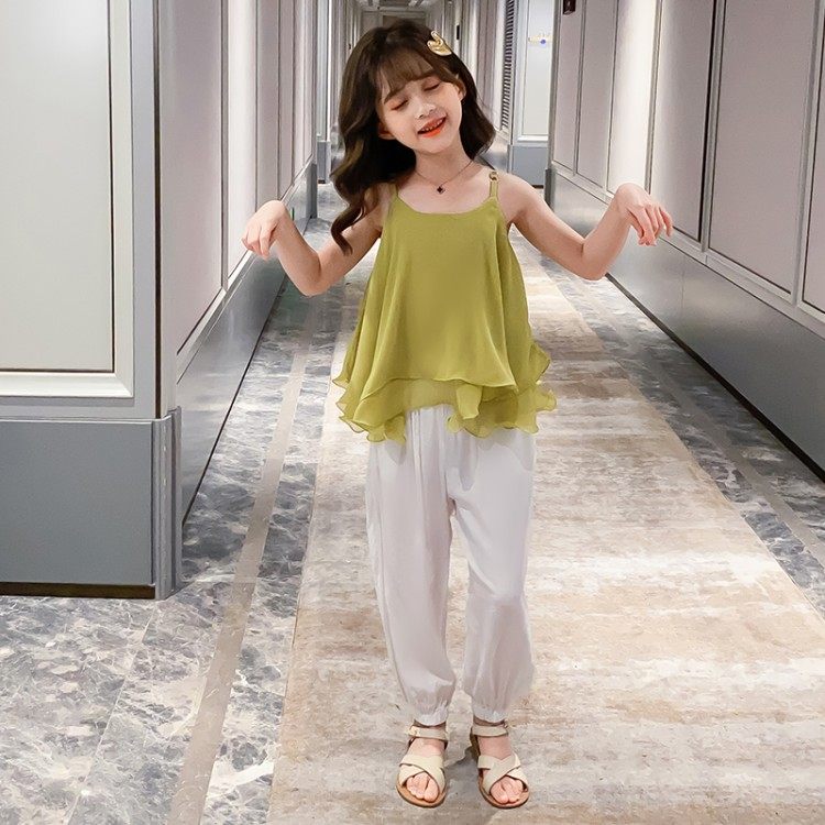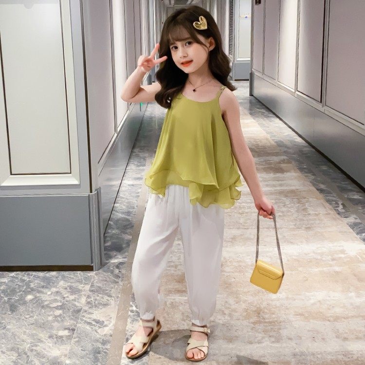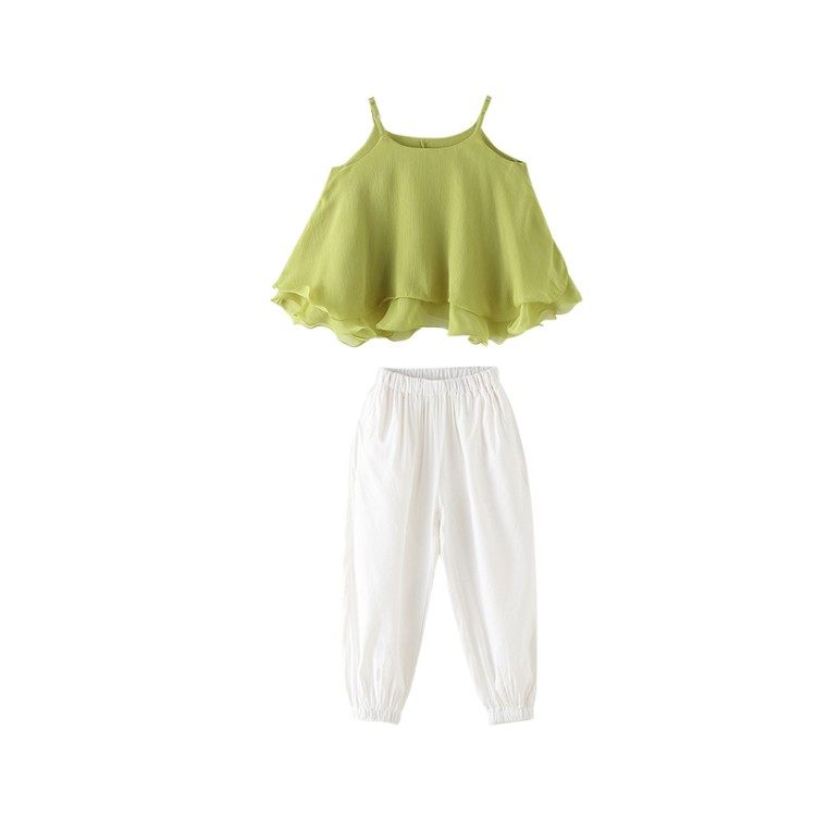 Korean girl net red suit summer 2021 new trend little girl green Western style sling fashionable two-piece suit