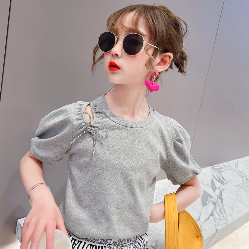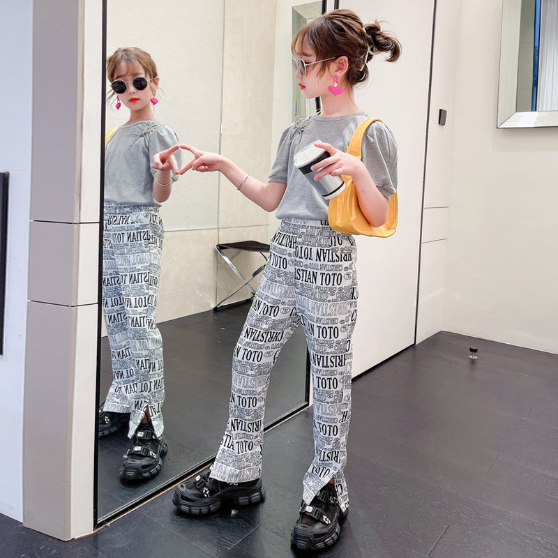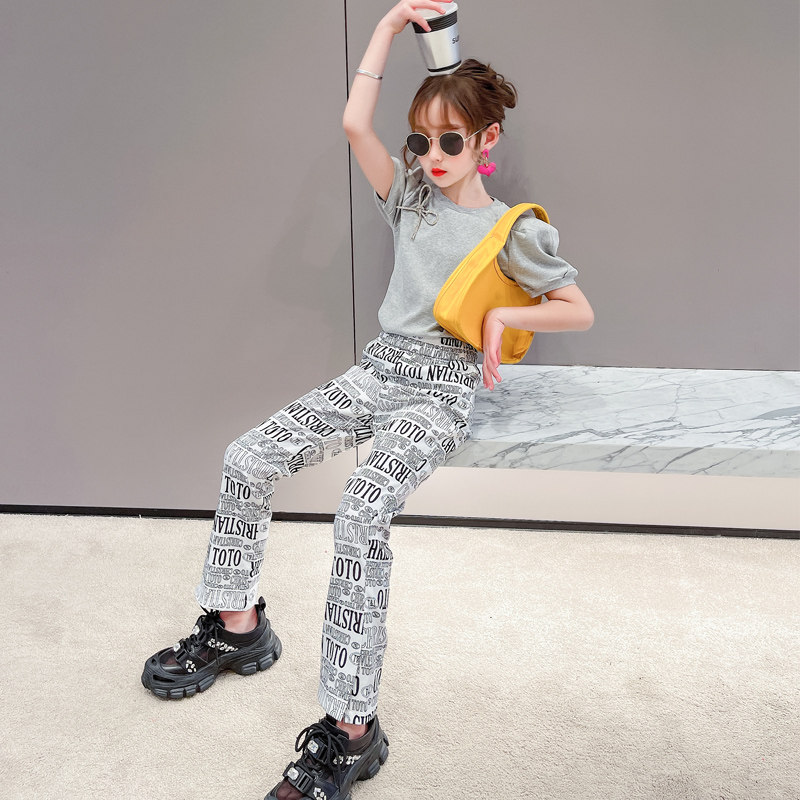 Korean girls' suits 2021 fried street children's clothing women's summer new fashion puff sleeves tide clothes letter pants two-piece set