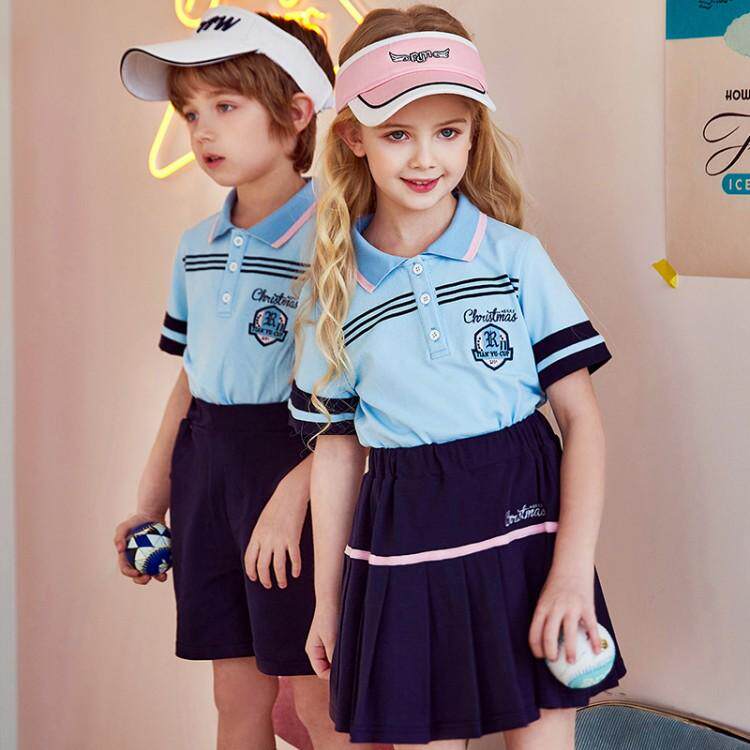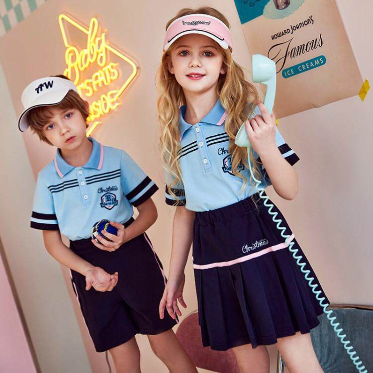Light Blue Boys T-Shirt Navy Shorts Light Blue Girls T-Shirt Navy Waist Skirt