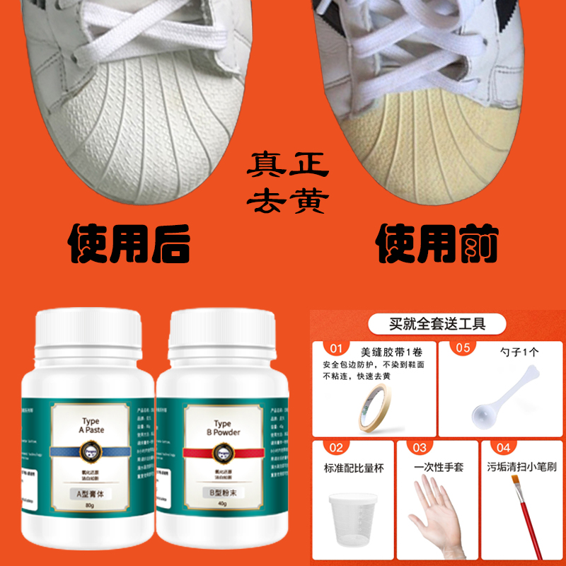 Small white shoes to yellow white shoes beside yellow shoes soles deoxidizer shell head air force cleaning agent yellow