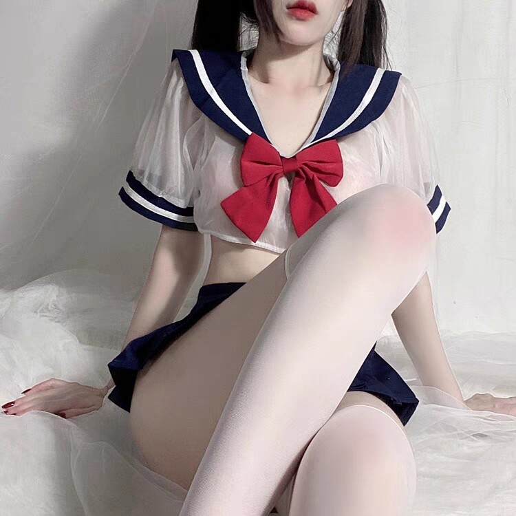 Miss Meow sexy pajamas maid outfit cute mesh transparent navy uniform temptation cos underwear set