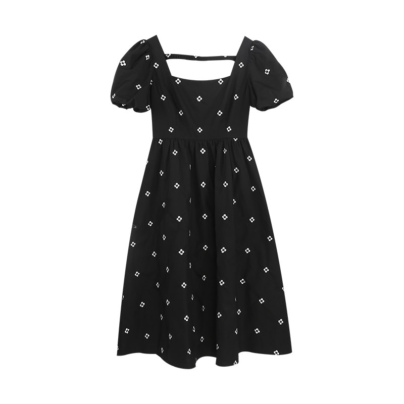Summer home black dew embroidered French square bubble short sleeve dress female meat shade lean over knee skirt