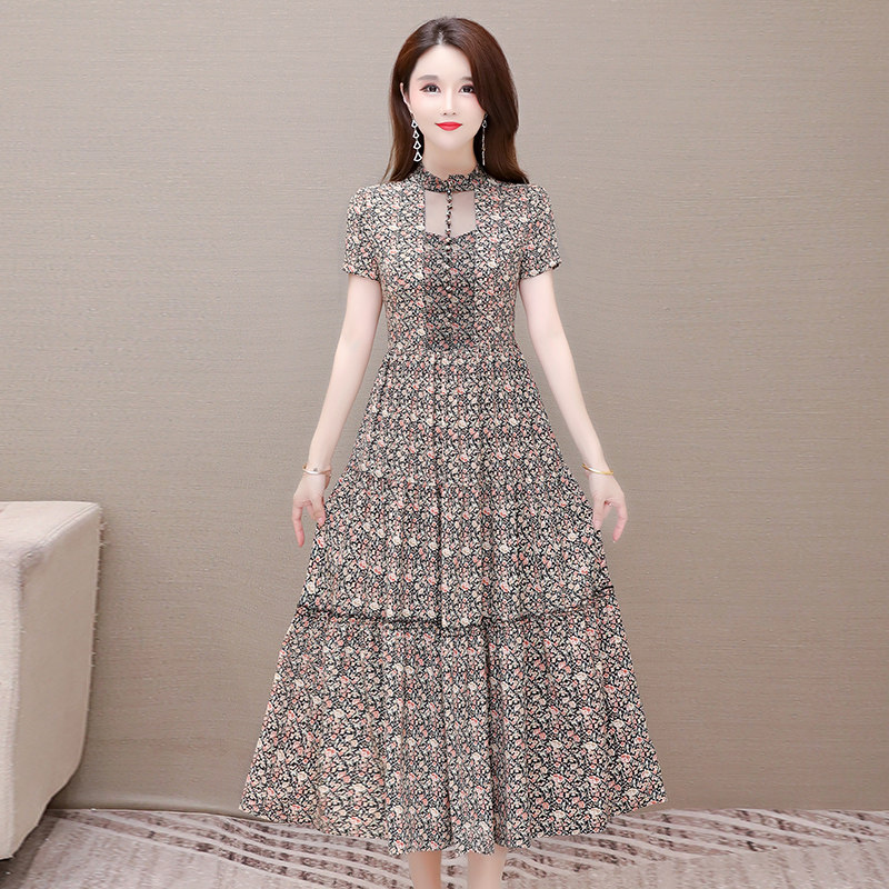 Floral dress women's clothing 2021 new spring and autumn fashion short-sleeved high-waisted belly-covered over-the-knee chiffon long skirt