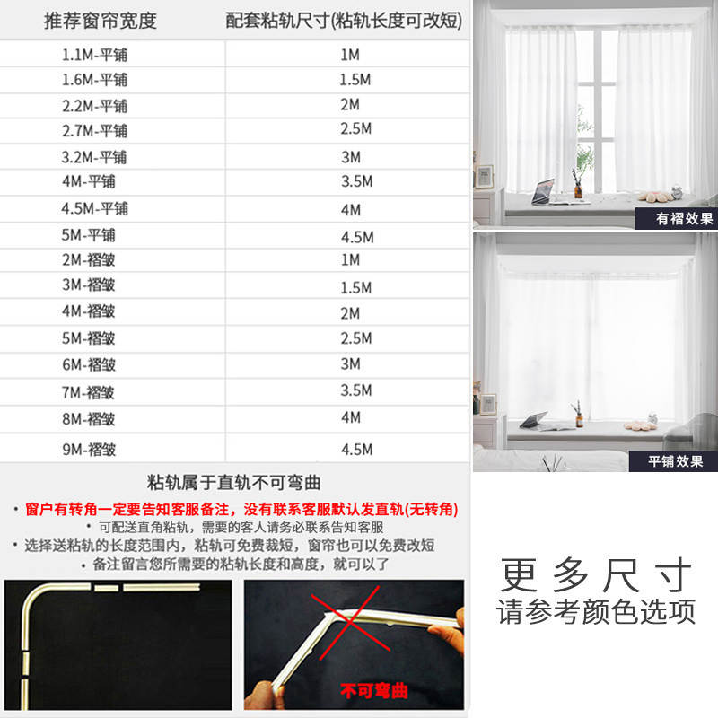If the window has a corner, you must tell the customer service size. It will be automatically photographed and not shipped. The height of the curtain and the length of the sticky rail can be shortened. Please contact customer service or remark and leave a message. Width 0 5* Height 1 3-