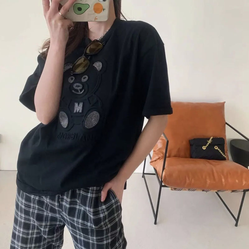 2021 summer new Korean version of the heavy industry hot diamond short-sleeved bear T-shirt women's casual top white ins women's half sleeves