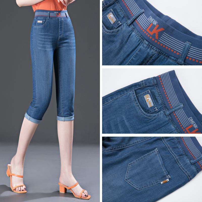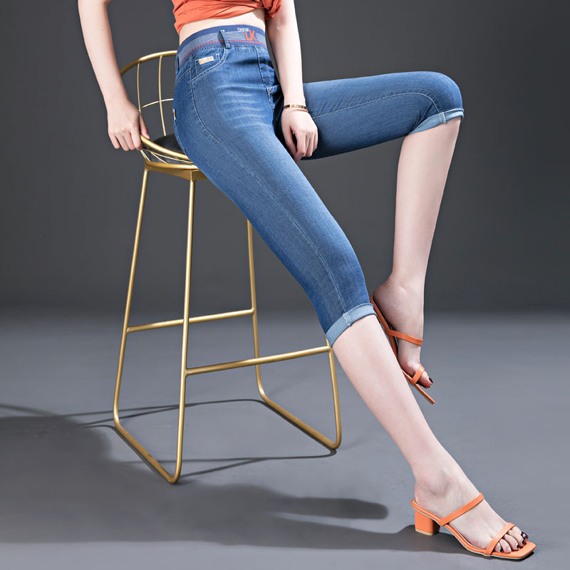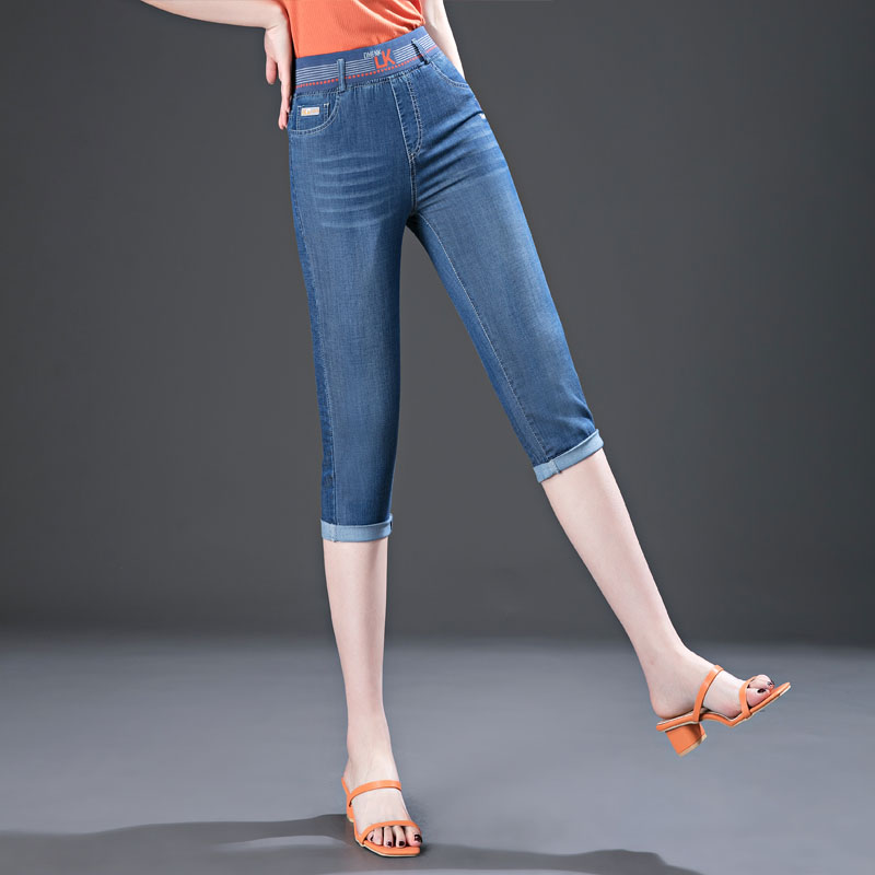 Summer thin denim three-point pants 2021 new Tencel high waist slim pants stretch thin rolled edge mom breeches