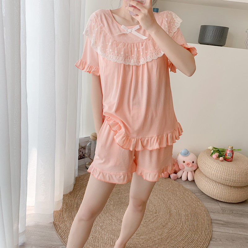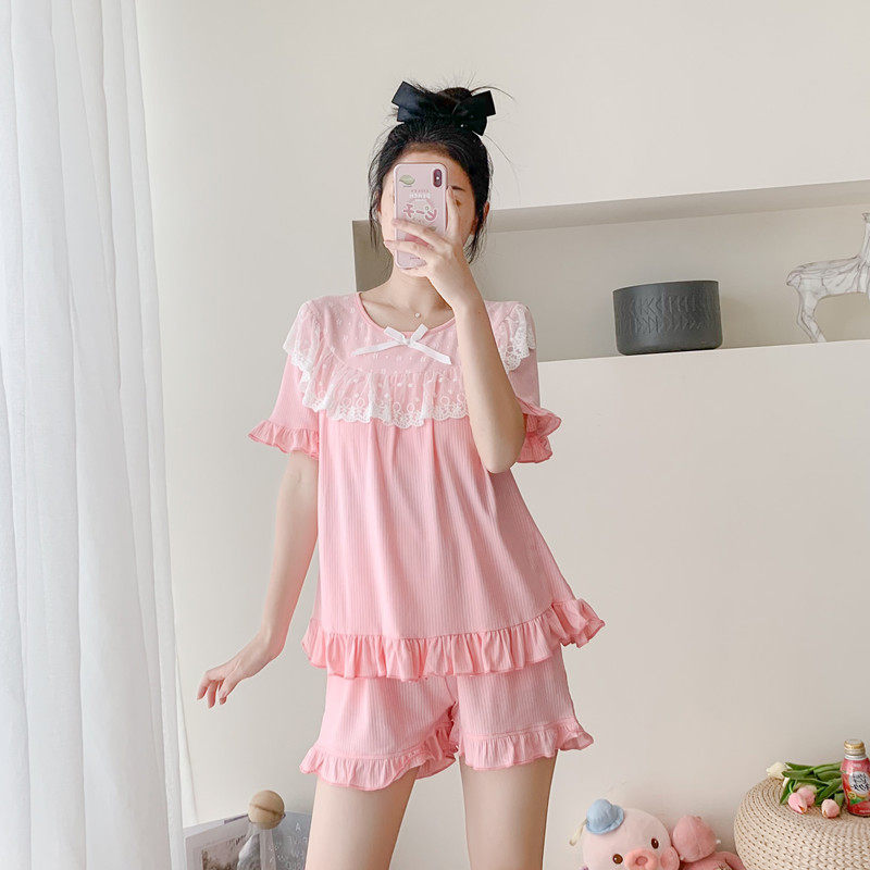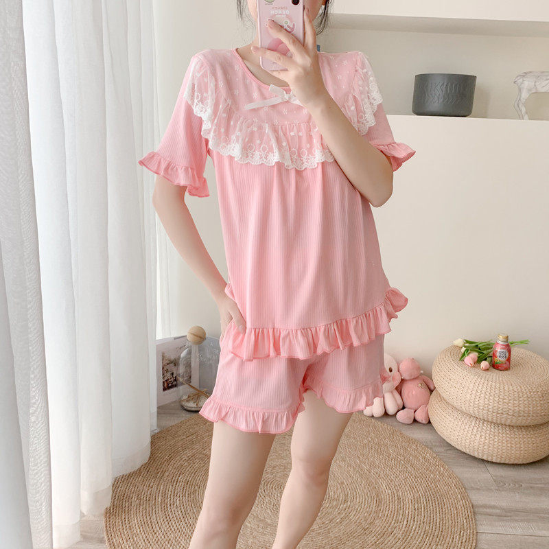 Short sleeve pyjamas woman summer with chest cushion pure cotton lace princess sweet and cute teenage girl Modale's home suit-Taobao