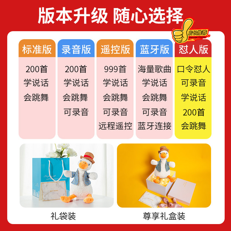 Bluetooth recording model, learn to speak (999 songs, gift bag, writing greeting cards), repeat duck basic model (200 songs, luxury gift box, writing greeting cards), remote control recording model, learn to speak