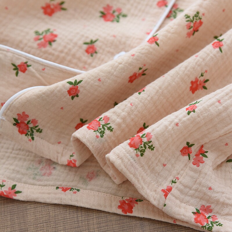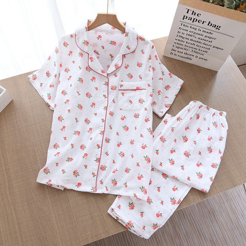 Pajamas Summer thin cotton double-deck gauze all cotton crepe short sleeve long pants home summer half-sleeve suit