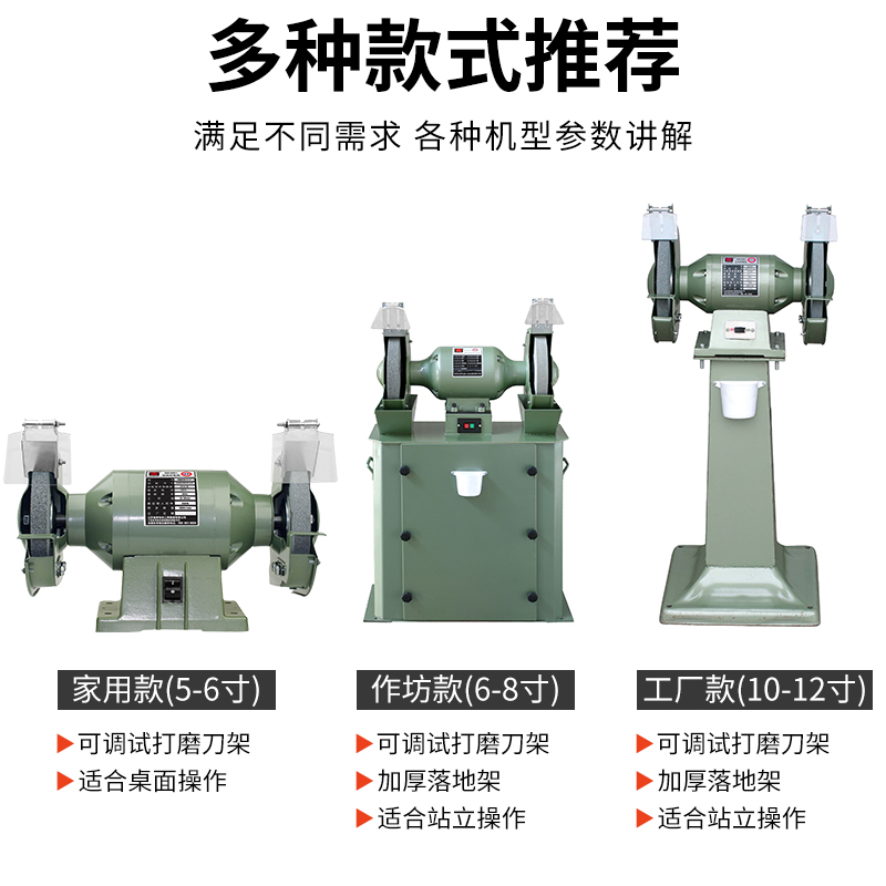 Grinder 5 inch 3213 220V120W Grinder 6 inch 3215-C 220V200W Grinder 6 inch 3215-S 220V150W Grinder 8 inch 3220 220V350W Grinder 10 inch 3225 (vertical) 300V700W Grinder 10 inch 3225 380V700W Grinder 10 inch 3225 (vacuum) 380V750W Grinder 12 inch 3330 380V300W Grinder 8 inch 3225 (vacuuming)
